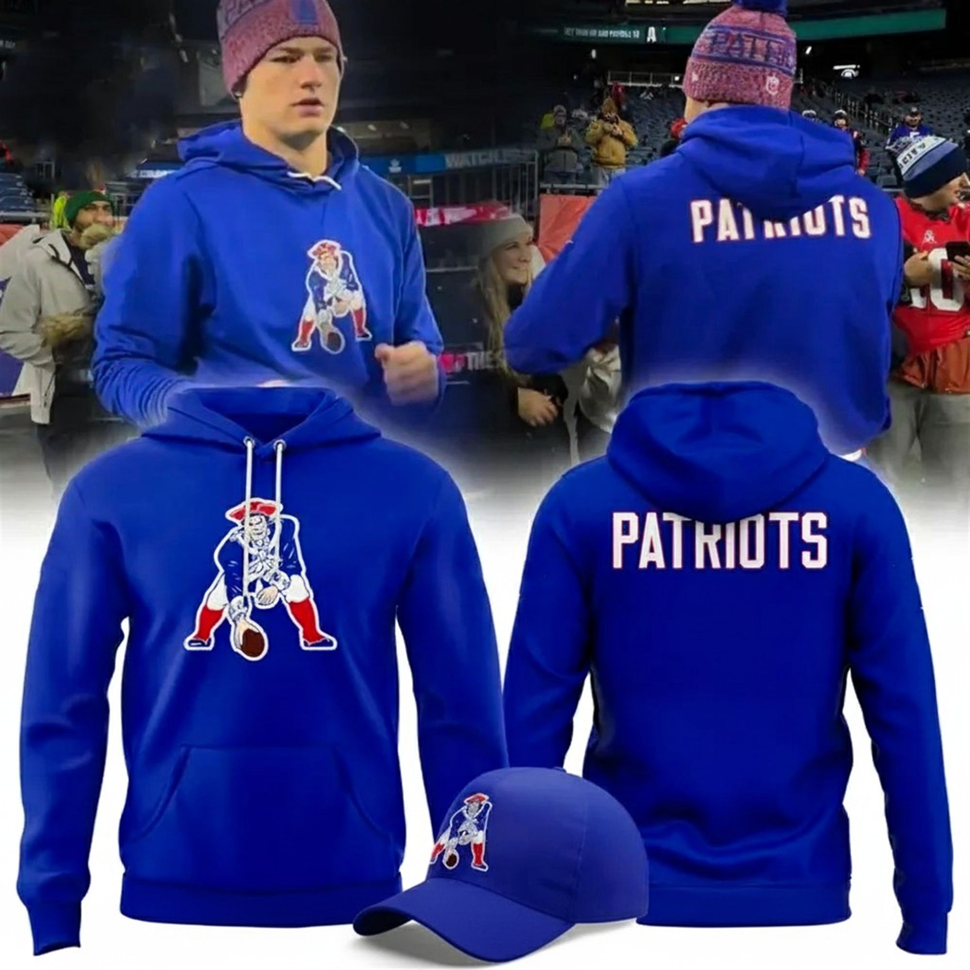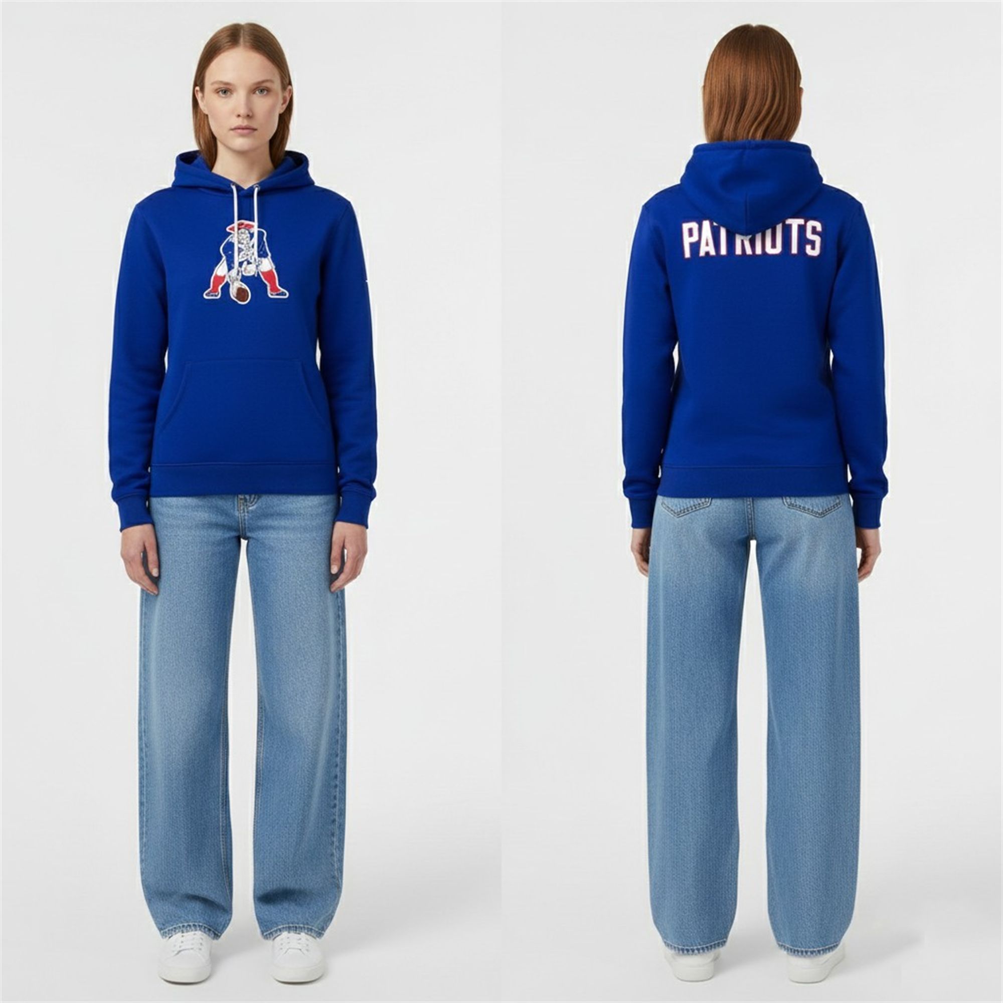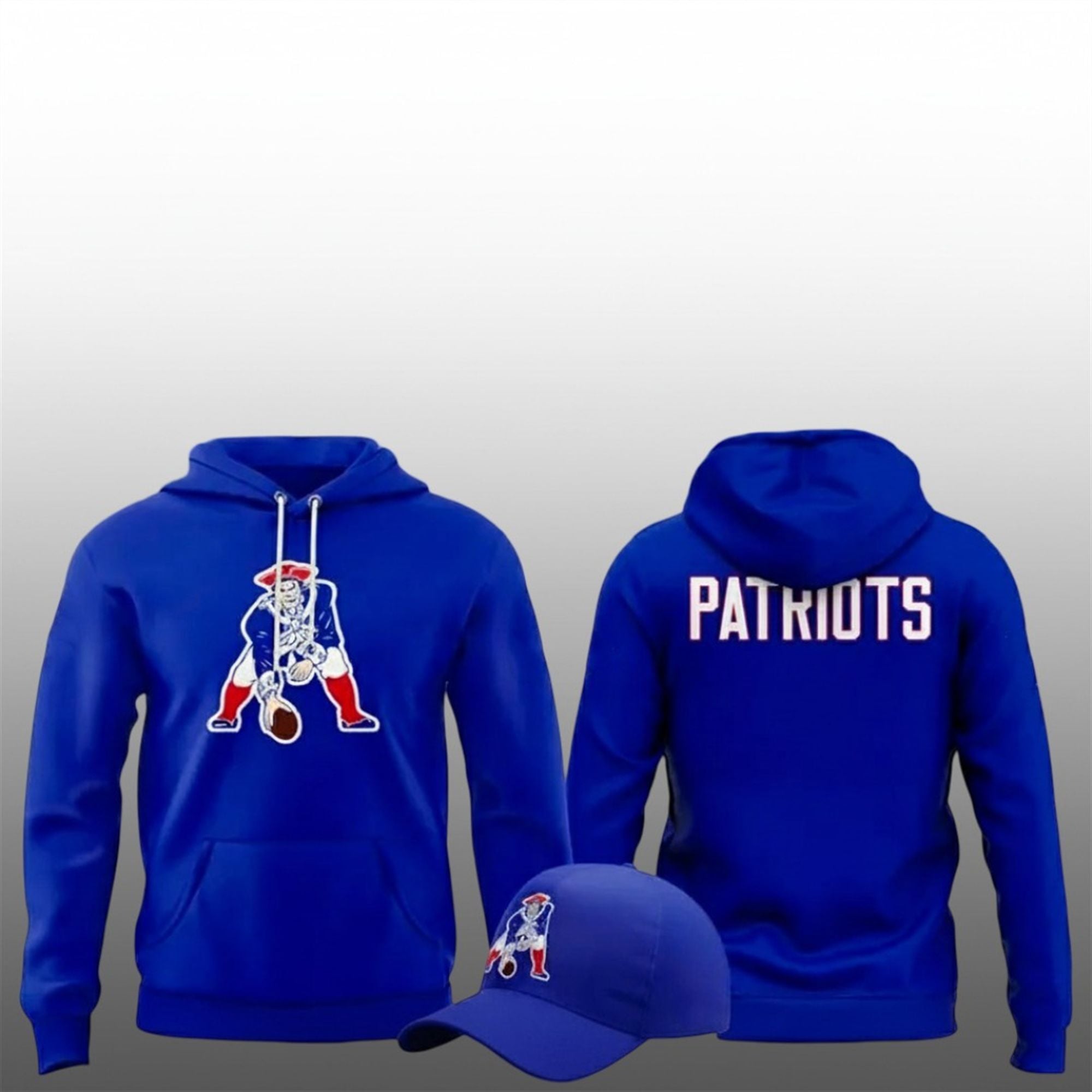 Crafted in a striking royal blue—a nod to the team’s classic color rush and throwback uniforms—this hoodie features the intricately detailed Pat Patriot mascot front and center. Unlike the modern “Flying Elvis,” this vintage logo represents the grit and determination of the franchise’s early years, now revitalized by a dynamic young quarterback. The back of the hoodie displays “PATRIOTS” in bold, white block lettering, ensuring your team pride is visible from every angle, whether you’re leaving the stadium or walking through the city.