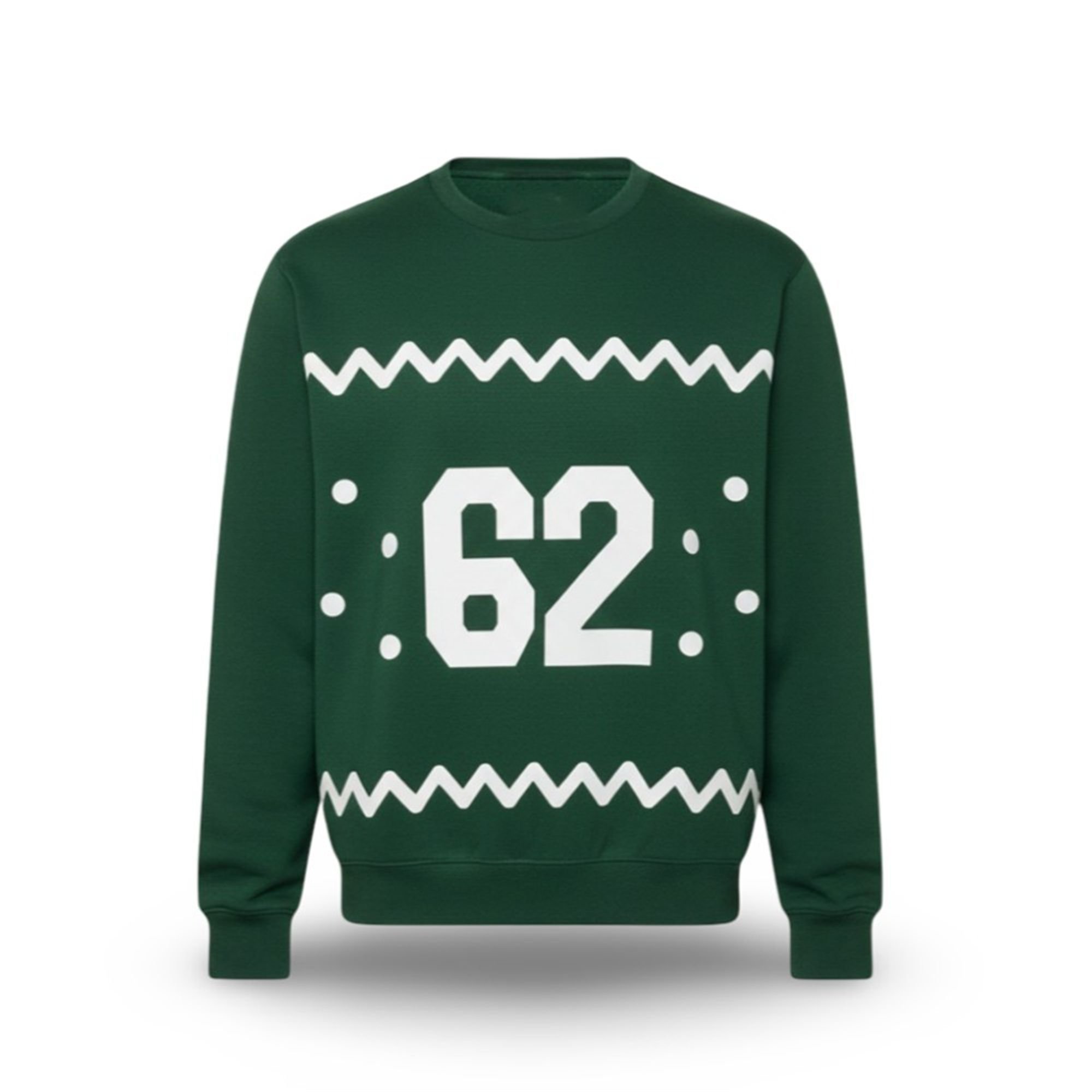 It features a bold, white, athletic-block “62” front and center, paying homage to the legendary number that will one day hang from the rafters. The number is framed by a retro-inspired pattern of festive white dots and the classic “ugly sweater” zig-zag waves. All of this is set against the timeless, signature Kelly green that defines the Eagles, creating a look that is both nostalgic and unmistakably Philly.
