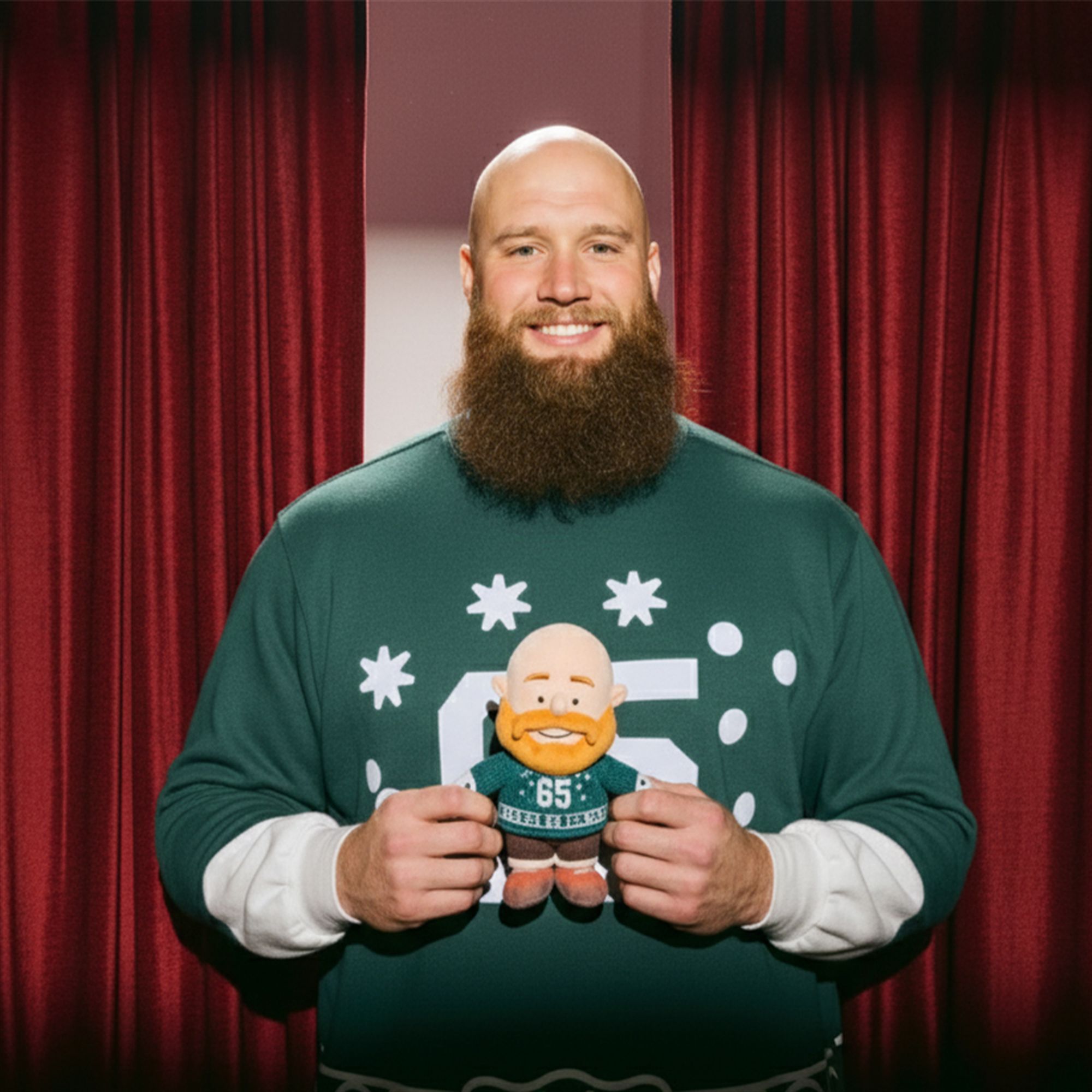 Designed with the same All-Pro grit and attention to detail that Lane brings to the field, this sweater is built to stand out. It features a bold, unmistakable “65” integrated directly into a festive, snowy design, all set against the iconic Eagles green. The classic crewneck cut and comfortable long sleeves (featuring a stylish white under-sleeve detail, as seen on Lane himself) make it perfect for layering over a thermal or under your favorite Eagles jacket on a cold game day.