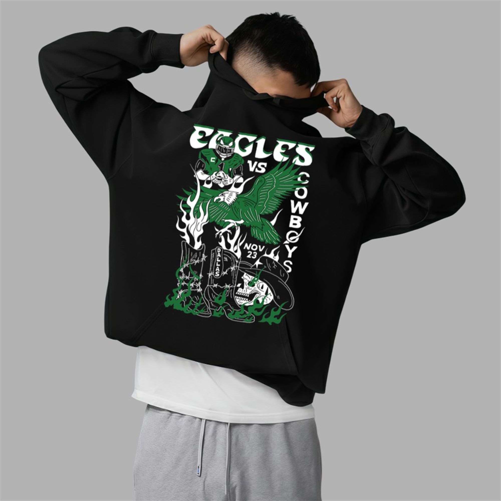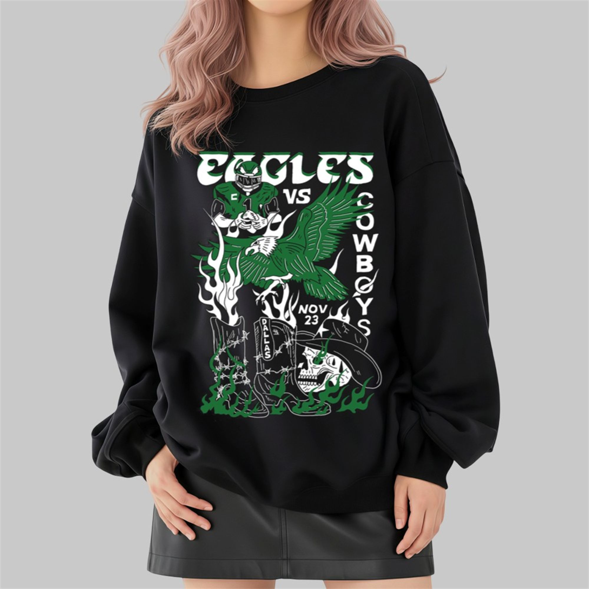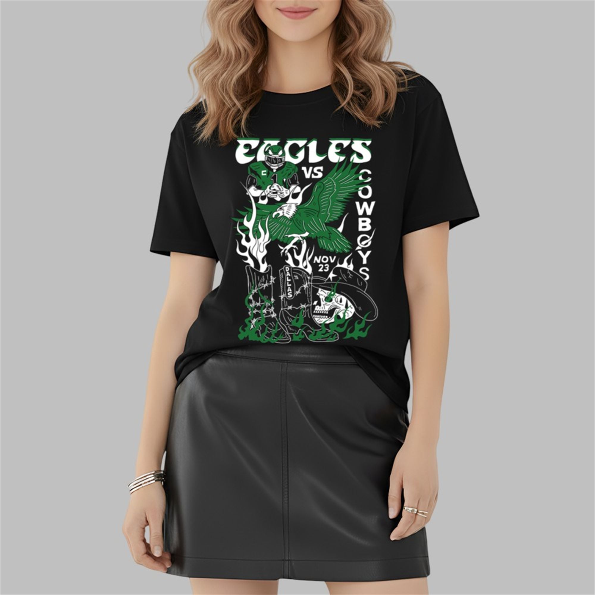 Capture the heat of the East rivalry with this Philadelphia Eagles Showdown in Dallas t-shirt. This product is specifically designed to commemorate the regular-season game scheduled for November 23, 2025. The graphic is a masterclass in sports storytelling, featuring a dominant, Kelly Green-accented Eagles swooping down with talons bared, engulfed in flames that rise from a pair of defeated cowboy boots and a skull. The “Eagles vs. Cowboys” typography utilizes a retro-inspired font that adds a vintage grit to the modern, high-energy design.