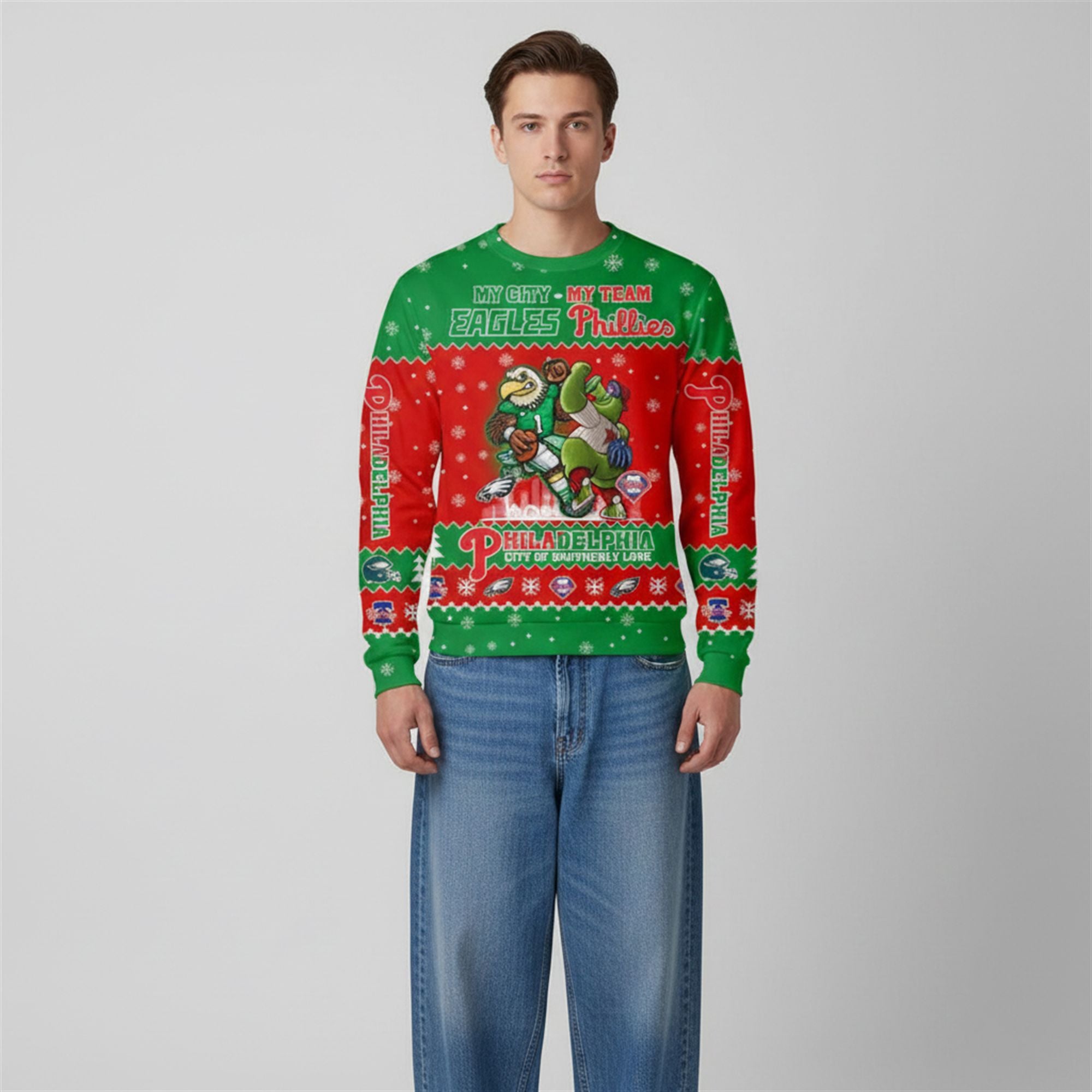 The visuals are striking. Set against a festive backdrop of Eagles green and Phillies red, the front of the sweater features an energetic illustration of the teams’ beloved mascots—Swoop and the Phillie Phanatic—teaming up in a show of unity. The design is framed by the bold text “MY CITY – MY TEAM,” leaving no doubt about where your allegiance lies.