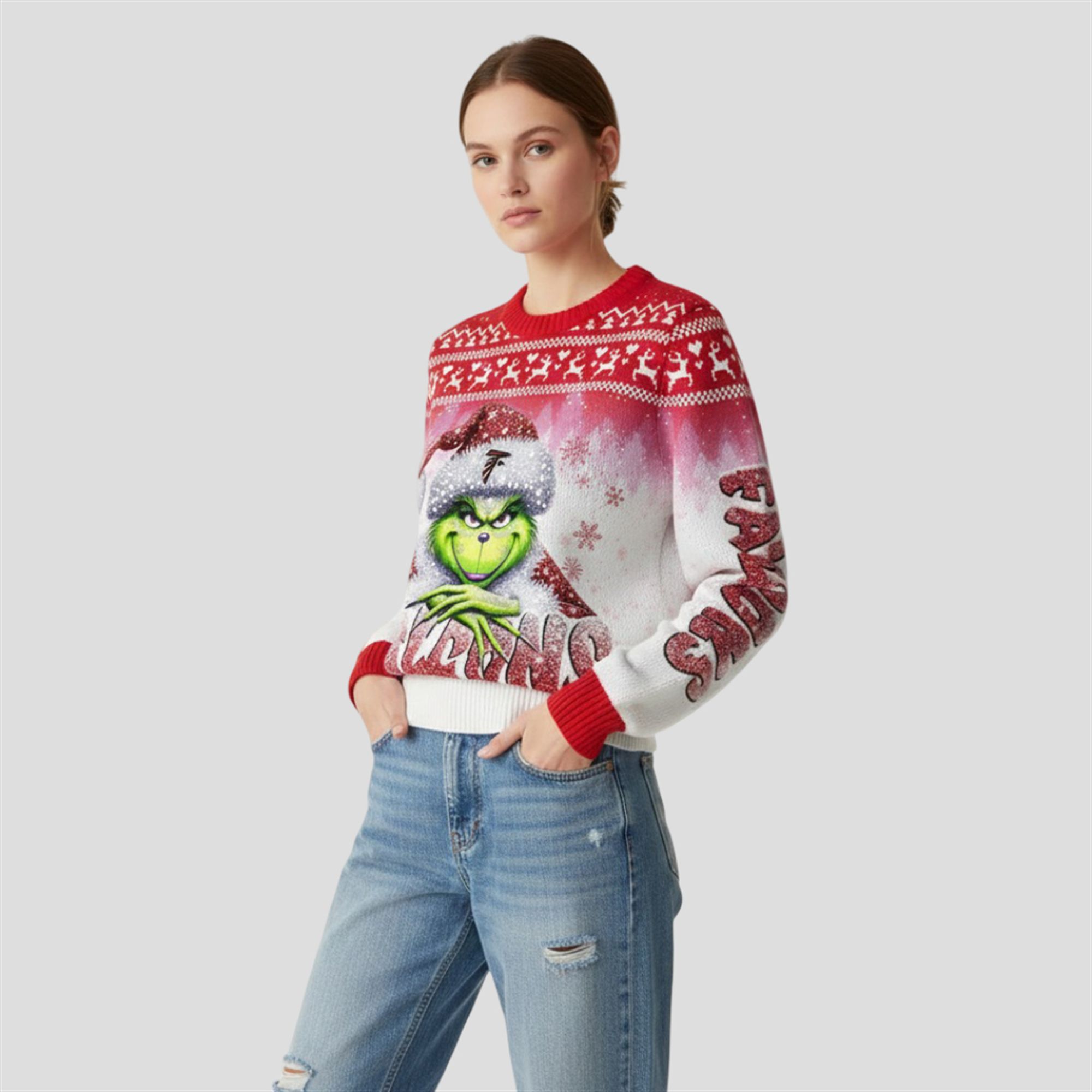 The design centers on a smirking, green holiday legend, arms crossed in confidence, wearing a Santa hat emblazoned with the Atlanta Falcons logo. The background is a winter wonderland of Fair Isle patterns, featuring snowflakes, reindeer, and festive geometric shapes in the team’s signature red and white colors. The word “FALCONS” is displayed in a bold, glitter-effect font across the chest, ensuring there is no mistake about where your allegiance lies.