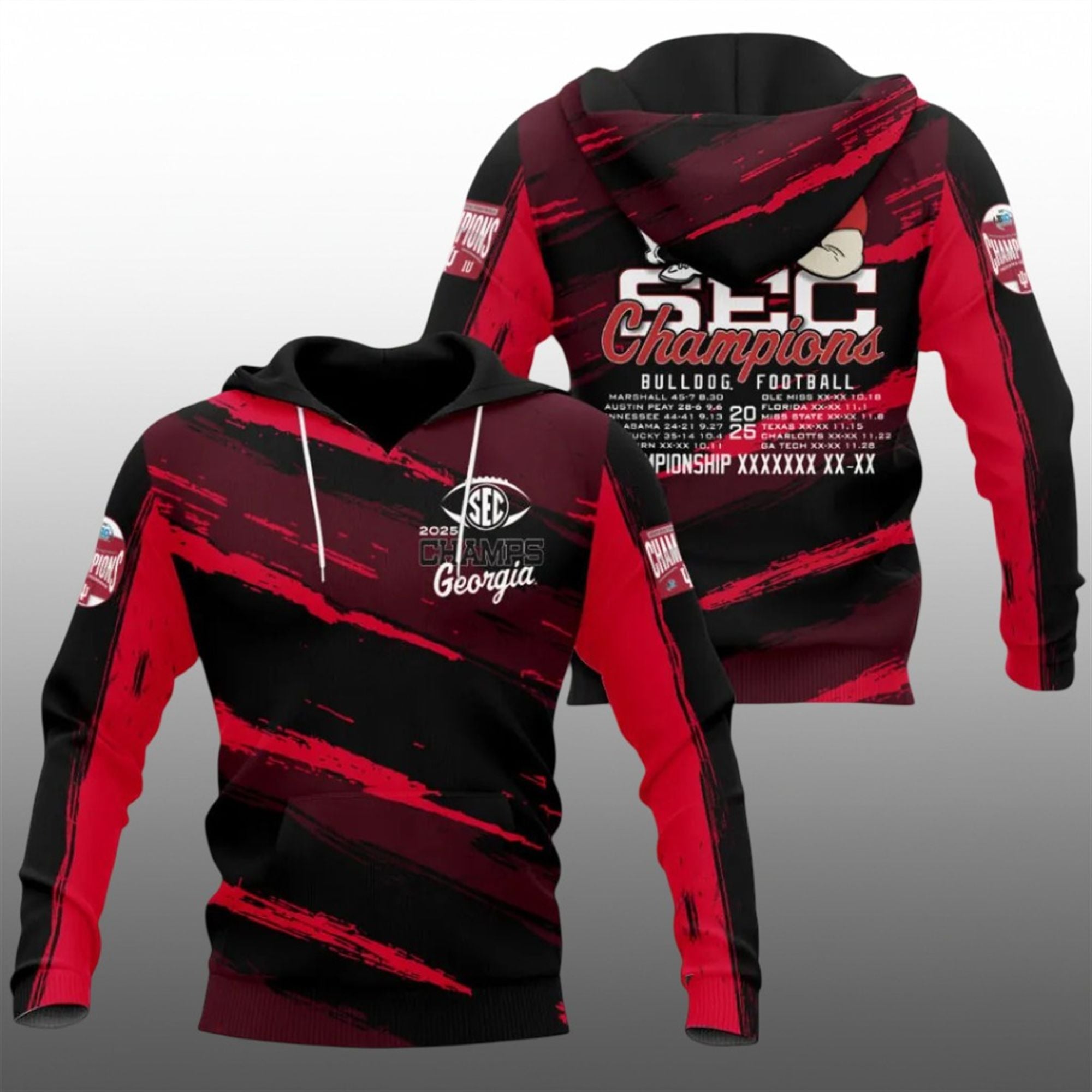 Front Design: The chest features a crisp, high-contrast “SEC 2025 CHAMPS Georgia” logo, immediately identifying you as a winner. Back Design: The real showstopper is on the back. It features a large, charismatic illustration of the Georgia Bulldog mascot leaning back in victory, embodying the swagger of the champions. Below the mascot is the bold text “SEC CHAMPIONS” in a varsity-style font, followed by a commemorative season schedule listing the scores of key victories that paved the road to the title.