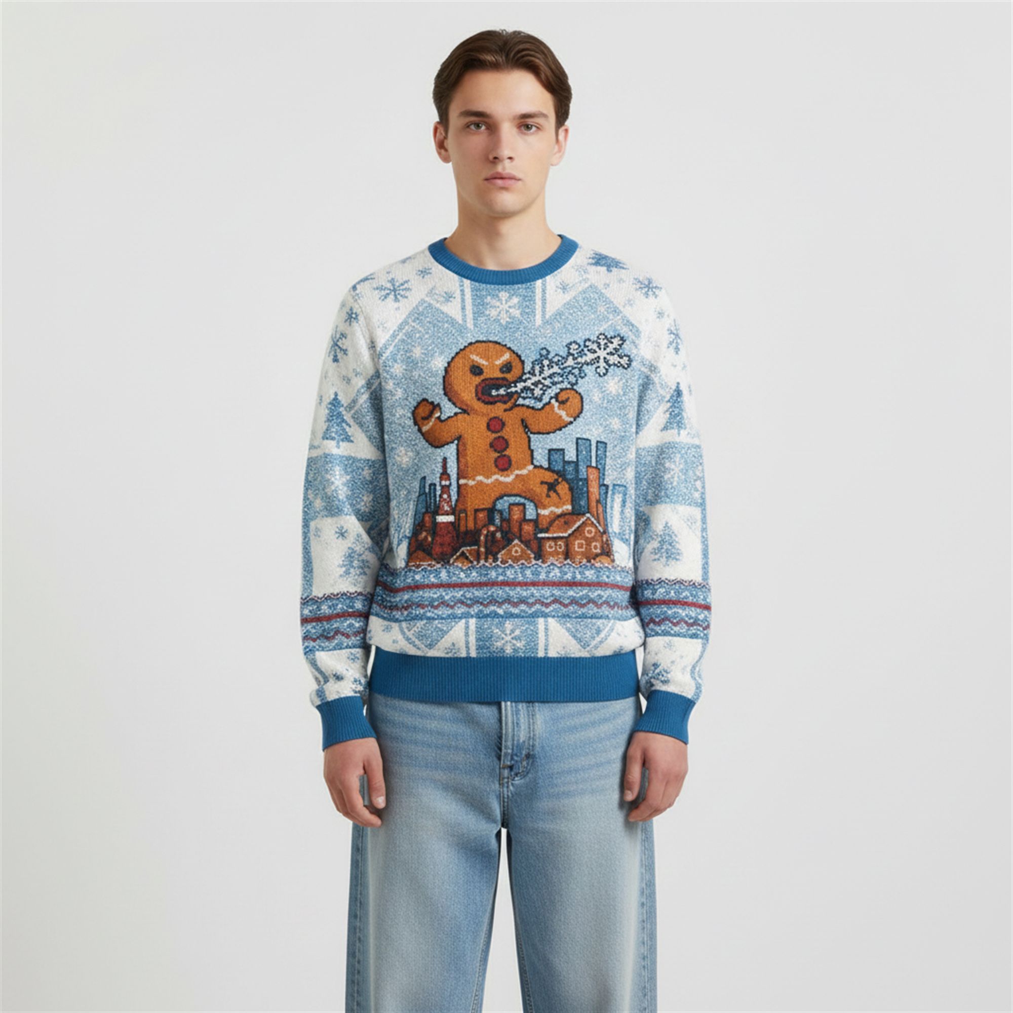 The holidays are usually about peace on earth, but the Gingerbread Monster Ugly Sweater has other plans. This visually striking garment reimagines the classic holiday cookie as a towering beast of destruction. Set against a backdrop of icy blue Nordic knitting patterns and falling snow, the centerpiece is a colossal, angry gingerbread man stomping through a metropolitan skyline.