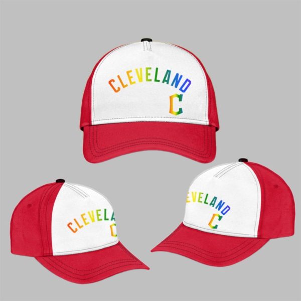 The design features a crisp white body with vibrant red sleeves, offering a bold and classic look. The front is emblazoned with “CLEVELAND” in a stunning rainbow gradient, symbolizing the diversity and pride of the community. The button-down front is accented with rainbow piping, adding a touch of vibrant detail.