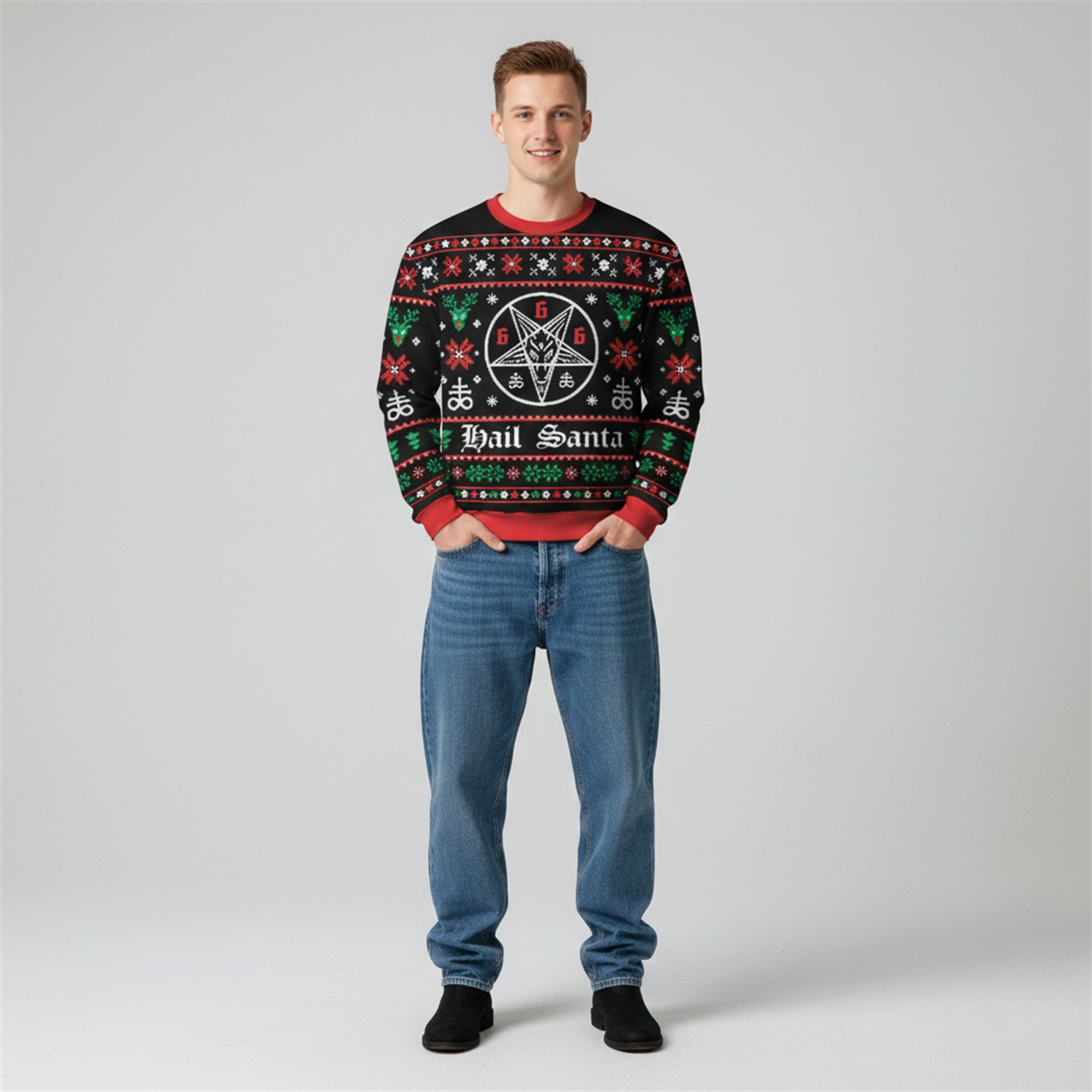 The Christmas season is usually dominated by cheerful elves and smiling reindeer, but the 2025 ChristmasĀ Hail Santa Ugly Sweater is here to balance the scales. This isn’t just a piece of clothing; it’s a badge of honor for the counter-culture crowd. The sweater centers around a striking, intricate Baphomet pentagram, flanked by “666” numbering and traditional Fair Isle patterns thatāupon closer inspectionāreveal inverted crosses and ominous skulls nestled among the snowflakes.