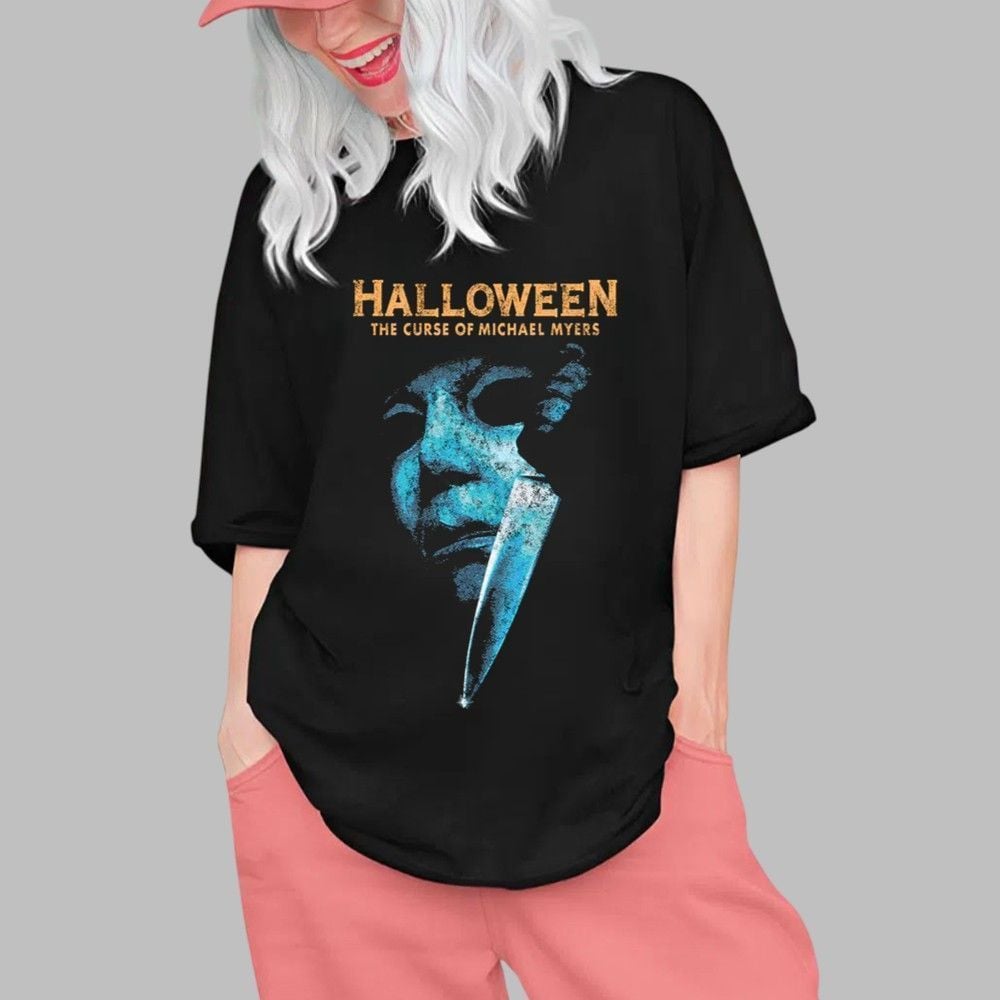 Our shirt features a masterfully recreated design that instantly evokes the grim atmosphere of the sixth installment in the iconic slasher franchise. The haunting, blue-hued visage of Michael’s mask stares out from the darkness, its expressionless features more terrifying than any monster. Overlaid is the glint of his signature chef’s knife, rendered with a chillingly realistic gleam that promises impending doom. Above this horrifying tableau sits the classic “HALLOWEEN” title in its distressed, unforgettable font, with “THE CURSE OF MICHAEL MYERS” anchoring the design. This powerful graphic is printed on a deep black background, ensuring the sinister artwork commands full attention. It’s a design that captures not just an image, but the very soul of 90s slasher cinema.