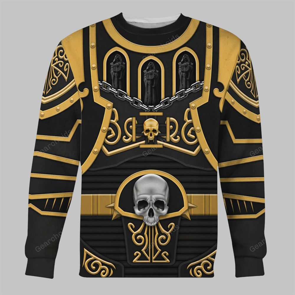 Forget cumbersome and restrictive cosplay; this set delivers the awe-inspiring look of ornate power armor with the superior comfort and flexibility of a premium tracksuit. The rich, deep black fabric serves as the canvas for stunningly detailed golden filigree, mimicking layers of blessed ceramite plating. From the iconic Inquisitorial “I” to the grim skulls and intricate scrollwork, every element is rendered in a vibrant, high-definition 3D print that brings the grim dark future to life.