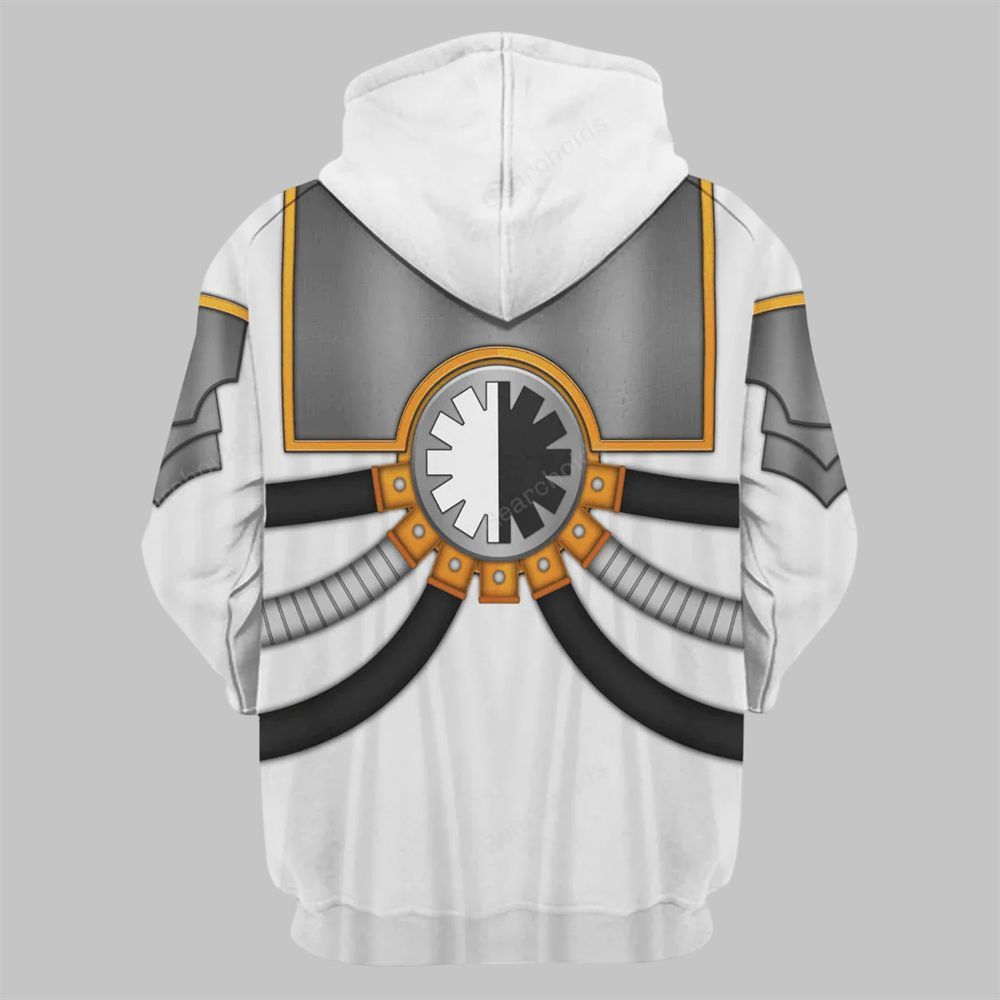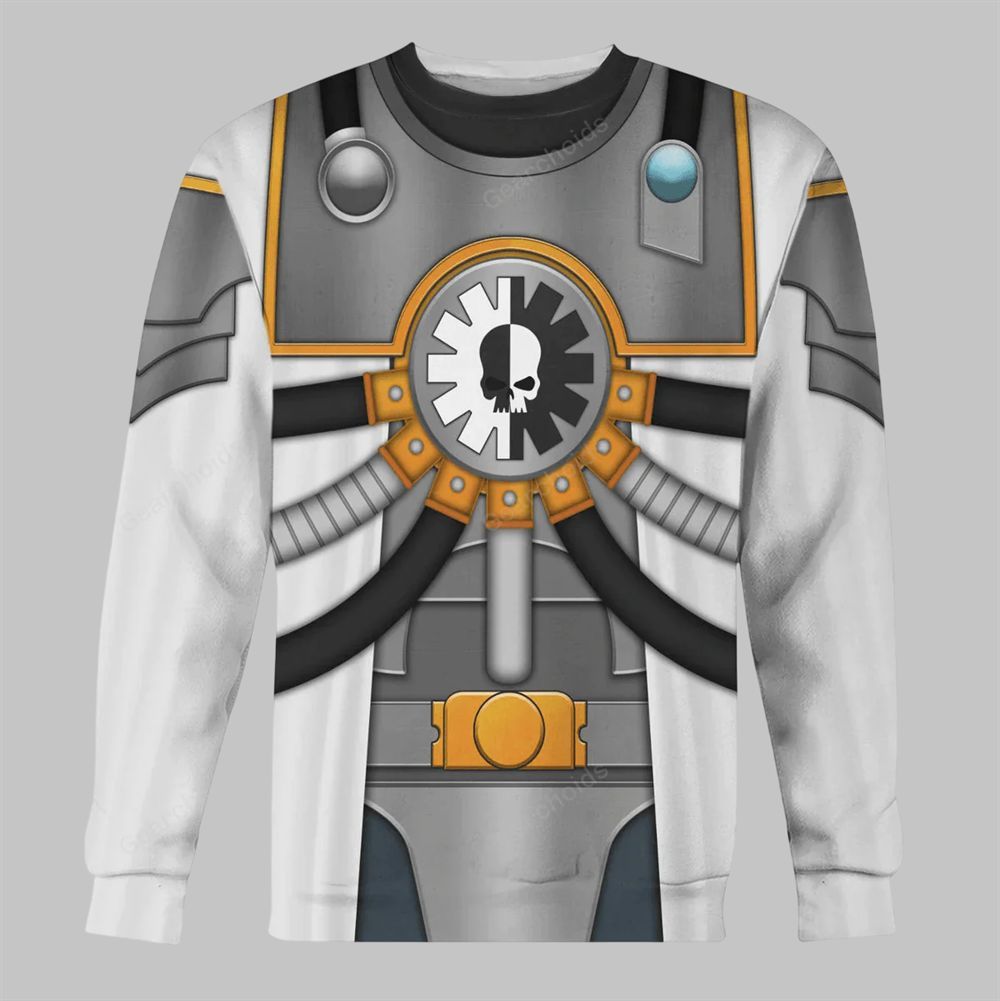 The hoodie and joggers feature a high-definition, 360-degree sublimation print that flawlessly replicates the signature white armor accented with bold red details, synonymous with the warriors of Metalica. The chest of the hoodie prominently displays the holy skull-and-cog symbol of the Adeptus Mechanicus, while the design incorporates the illusion of layered plasteel plates, complex wiring, and sacred purity seals. This all-over print creates a stunning 3D effect that gives you the look of a fully armored Tech-Priest or Skitarii warrior with the ease and flexibility of a premium tracksuit.