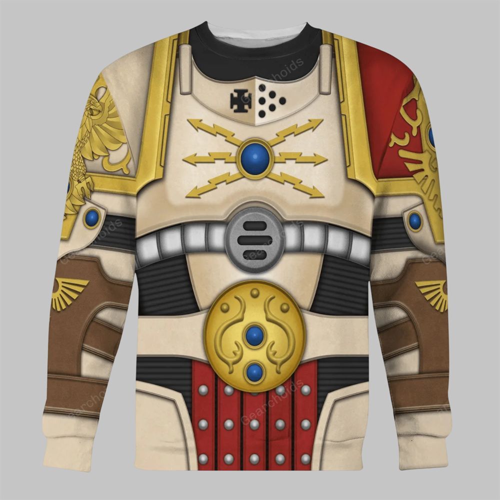 The design is printed using advanced sublimation technology, ensuring the brilliant gold trim, pristine ivory-white ceramite plating, and striking crimson pauldrons are rendered in stunning, photorealistic detail. The front features the unmistakable lightning-bolt aquila of the Custodes, symbolizing their ancient duty, while the intricate belt and gorget details complete the illusion of authentic power armor. Every segment, rivet, and emblem has been carefully recreated to provide a 360-degree costume experience that will impress even the most dedicated loremasters.