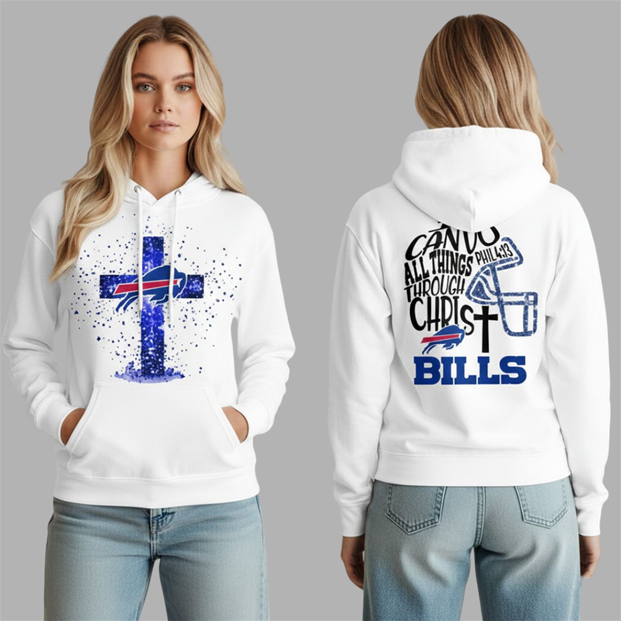 The Back: Showcases an intricate typography design reading “I CAN DO ALL THINGS THROUGH CHRIST PHIL 4:13.” It is accented with a football helmet graphic, a cross, and the bold “BILLS” text, ensuring your allegiance is visible from every angle.