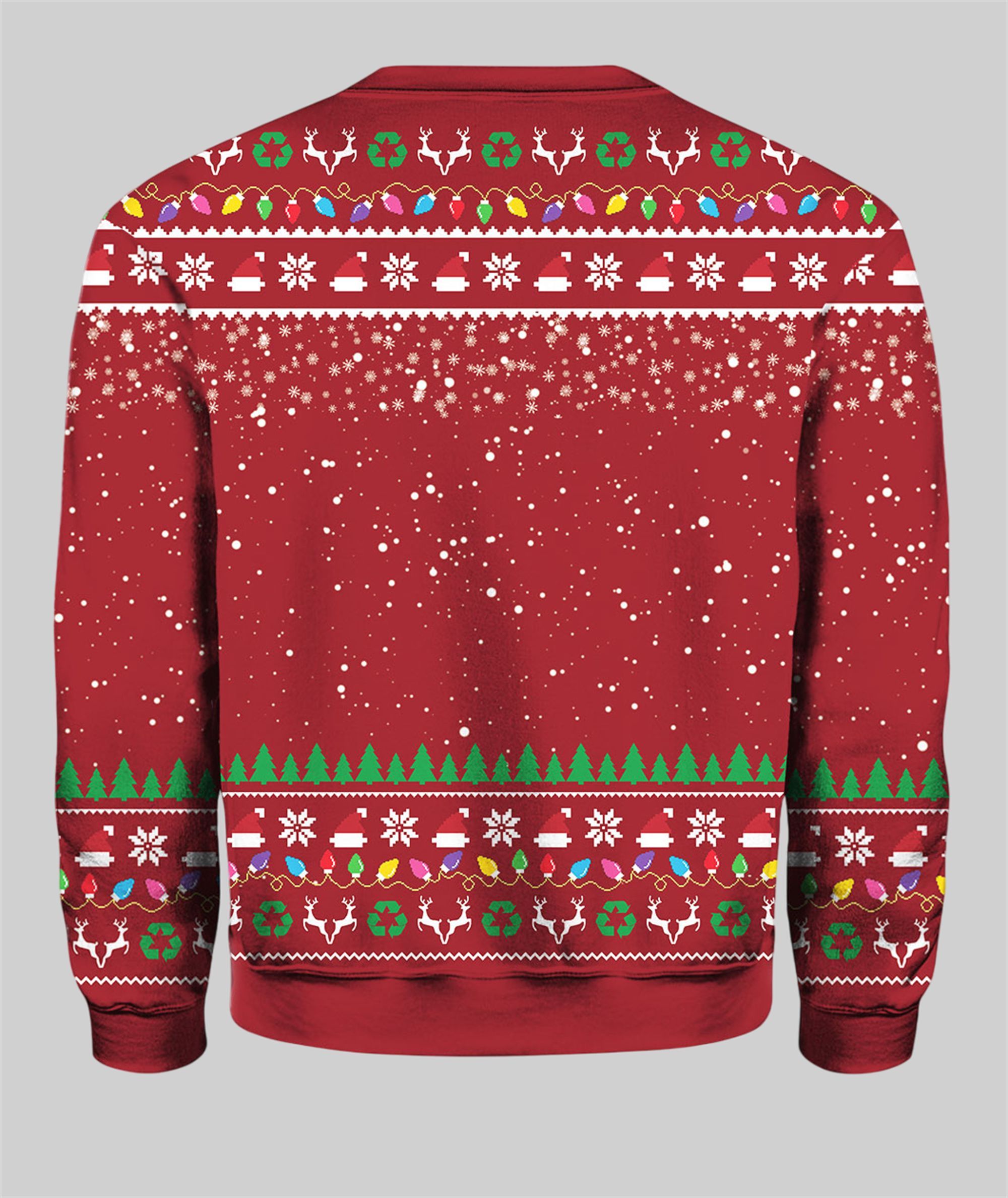 Forget generic holiday patterns. This sweater is a masterpiece of festive irony. Set against a vibrant, holly-red backdrop sprinkled with a delicate snowfall pattern, it features all the classic ugly sweater elements you love: rows of charming reindeer, festive Christmas lights, crisp white snowflakes, and neat little green pine trees. But the true genius lies in the bold centerpiece—a bright green, universally recognized recycling symbol. Encircling this iconic logo is the brilliant punchline: “I SUPPORT RECYCLING | I WORE THIS SHIRT LAST YEAR.” It’s a clever, witty statement that’s guaranteed to get a round of laughter and appreciative nods.