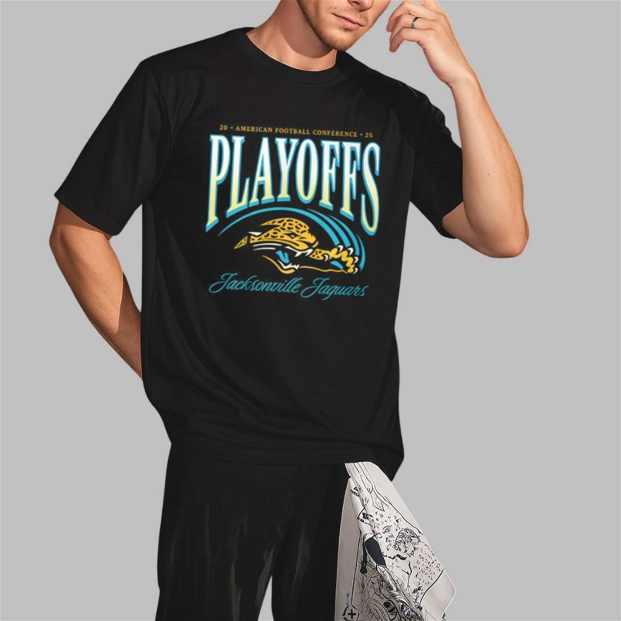The shirt is the definitive fan essential for the current postseason. As the Jaguars solidify their place among the AFC elite, this apparel item captures the magnitude of the moment. The design centers on a bold, vintage-styled typography treatment of “PLAYOFFS” that arches dynamically over the iconic Jaguars mascot. The artwork utilizes the team’s signature teal, gold, and black palette but applies a “throwback” filter that resonates with current fashion trends favoring 90s sports aesthetics.
