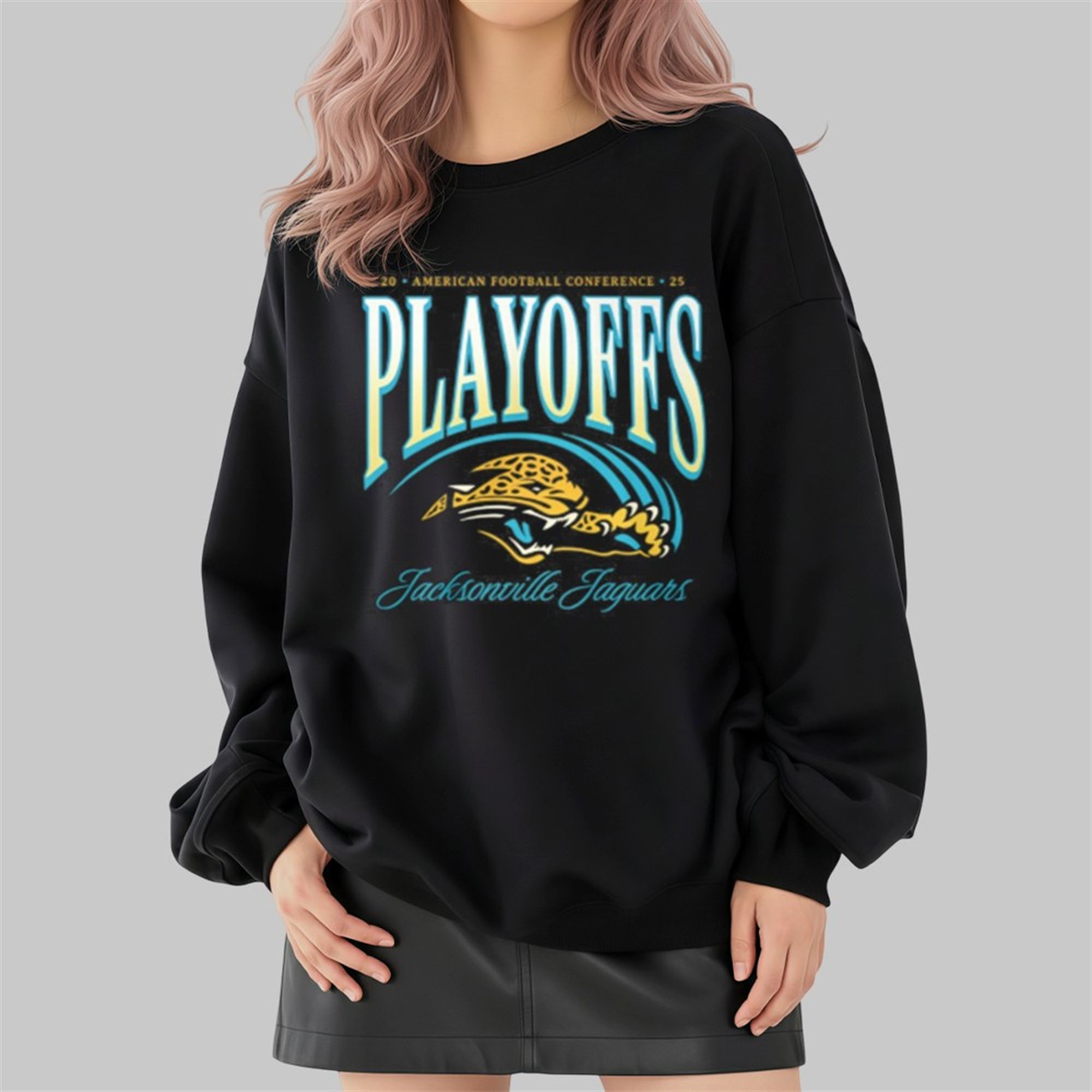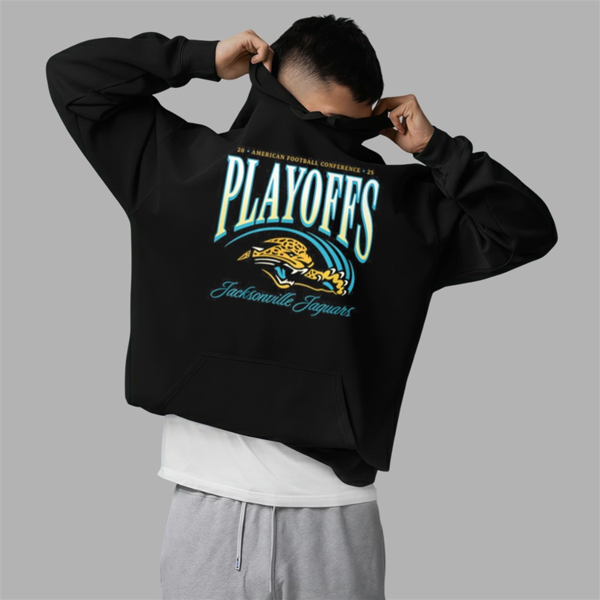 This specific design exploded across social media because it perfectly merged the “90s nostalgia” trend with the high-stakes excitement of the 2025 playoffs. Influential fan accounts and local Jacksonville celebrities began sharing the “crawling jaguar” retro look, praising it for ditching modern minimalism in favor of bold, old-school grit. The electric teal typography became an instant meme format for “Playoff Mode Activated,” causing the image to trend locally in Jacksonville and nationally among fashion circles.