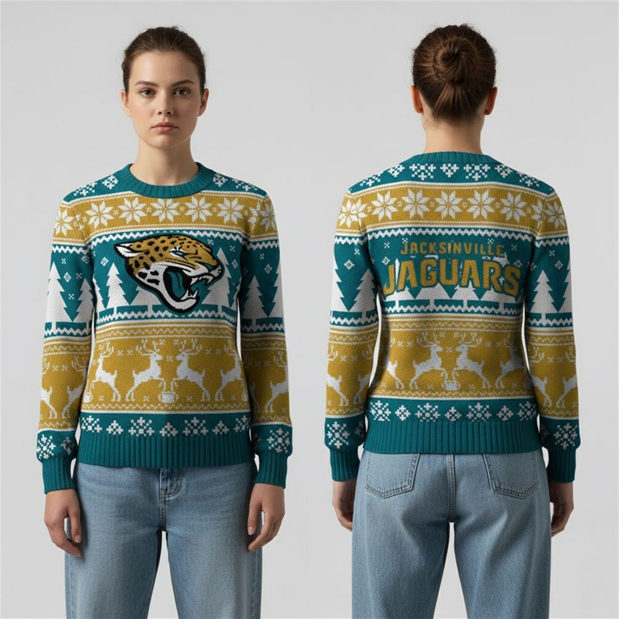 The design features a striking base of the Jaguars’ signature deep teal, accented by bold gold and crisp white patterns. On the chest, the iconic snarling Jaguar head logo sits proudly, instantly recognizable to any fan. The sweater is intricately detailed with festive iconography—rows of snow-covered evergreen trees, delicate snowflakes, and leaping reindeer flanking a football, creating a playful “winter wonderland” vibe with a sporty twist. The back of the sweater creates a jersey-like effect, boldly displaying “JACKSONVILLE JAGUARS” across the shoulders, ensuring everyone knows who you root for, coming or going.
