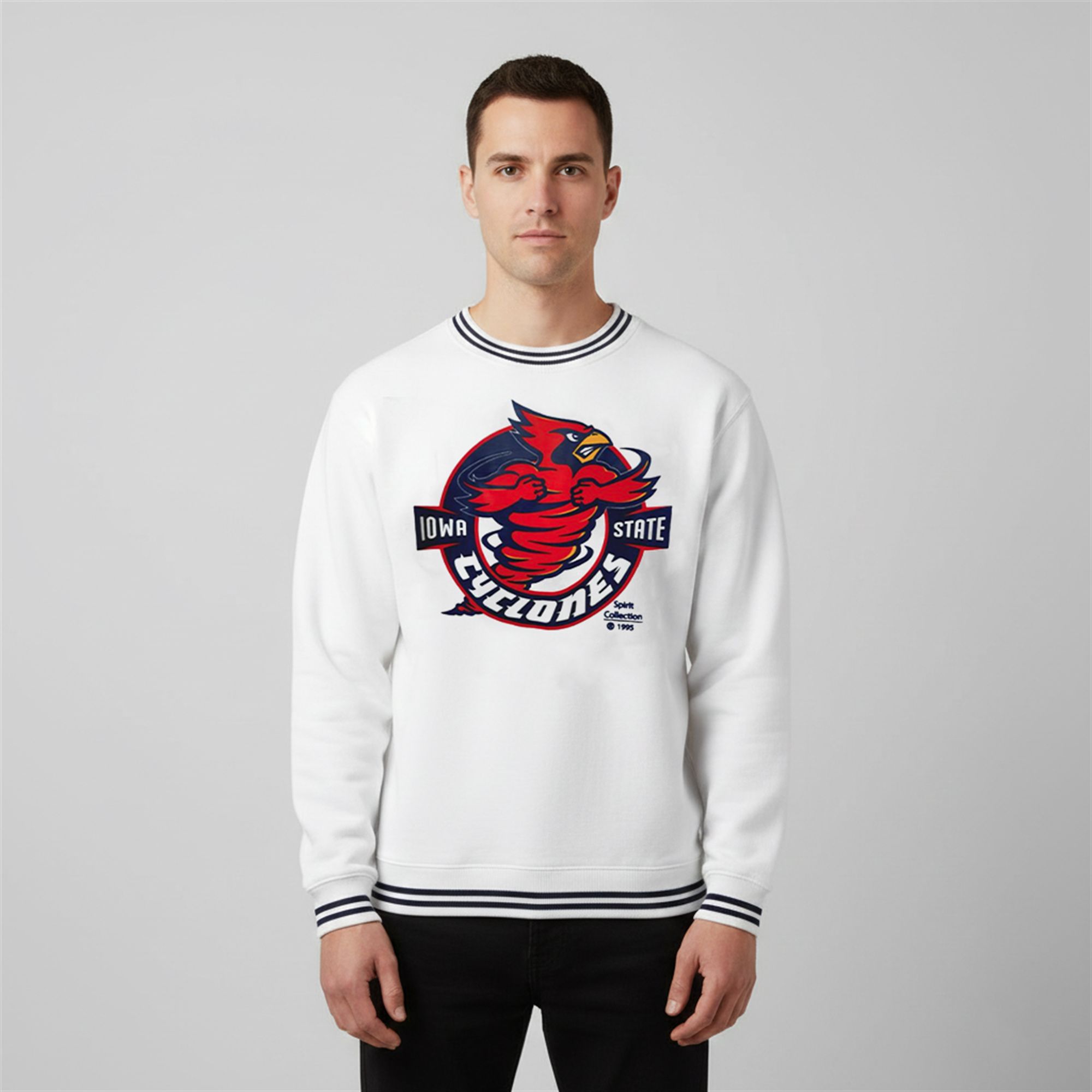 The Iowa State Cyclones Spirit Sweater is a reproduction of the classic 1995 design, bringing a touch of retro flair to the modern fan’s wardrobe. This sweatshirt features a crisp white base aimed at making the bold Cyclone graphics pop. At the center lies the vintage, muscular incarnation of Cy the Cardinal, fiercely spinning within a tornado—a logo that evokes the intense energy of Iowa State athletics.
