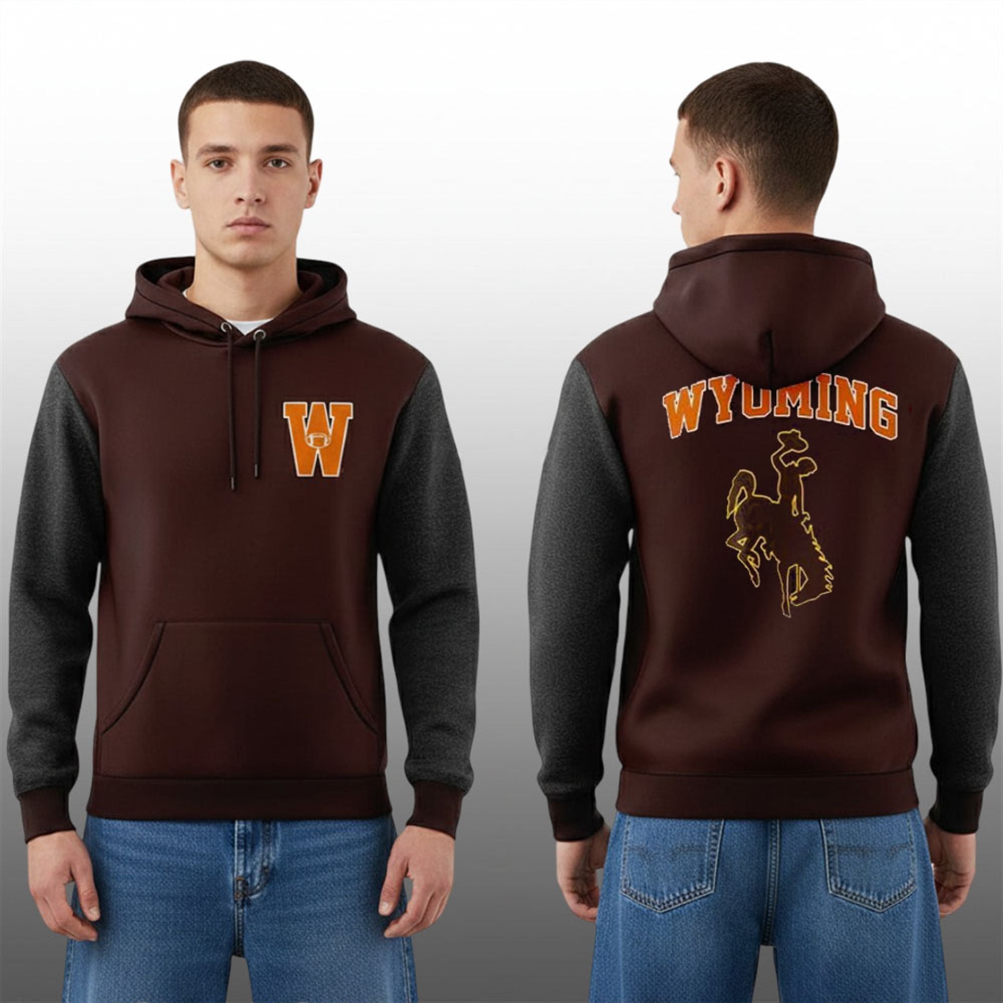 The hoodie is designed for the fan who appreciates football history. While standard team gear is often single-colored, this premium hoodie features a stylish raglan-inspired color-block design, combining the traditional Wyoming Brown body with sleek, charcoal-black sleeves.