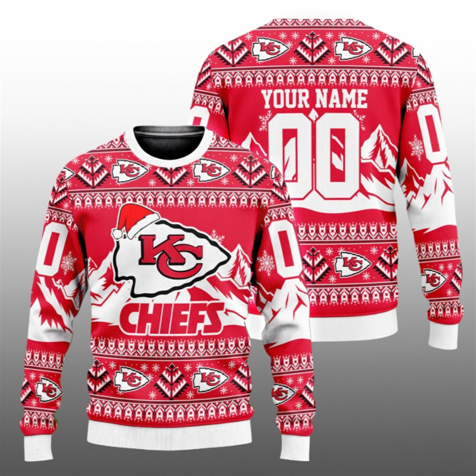 The design features a vibrant, high-definition all-over print that captures the spirit of winter football. The front showcases the legendary KC Arrowhead logo playfully topped with a Santa hat, set against a backdrop of snow-capped mountains and evergreen trees. The “CHIEFS” bold lettering anchors the design, while intricate Fair Isle patterns—featuring snowflakes and geometric shapes—border the sleeves and hem, giving it that classic “ugly sweater” charm without sacrificing style.
