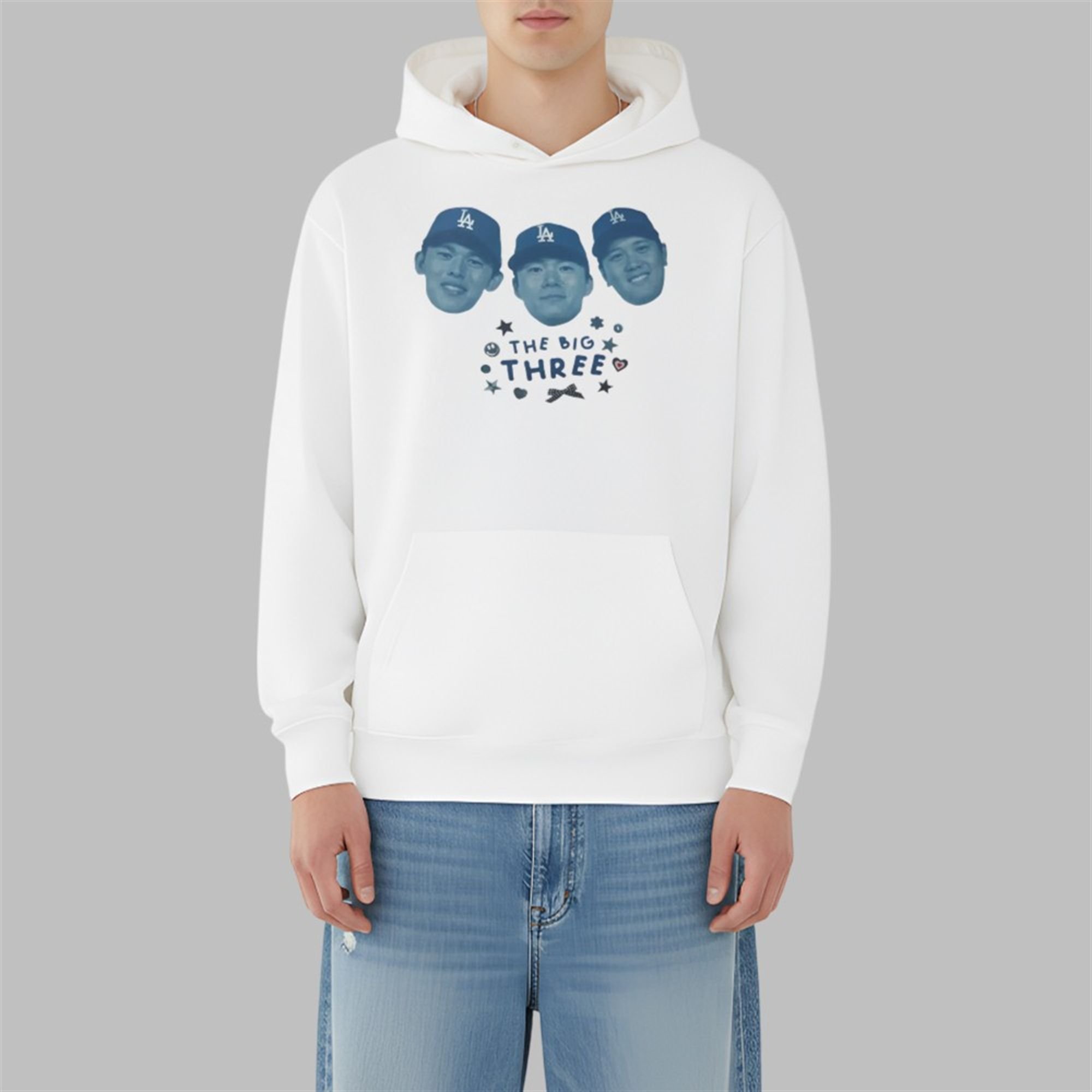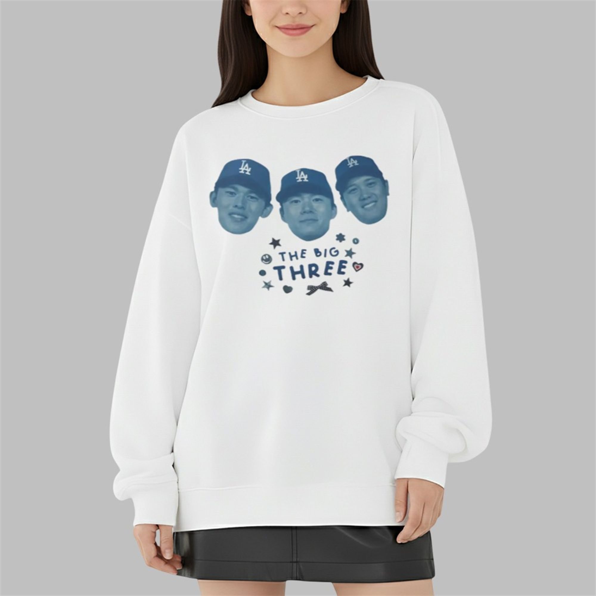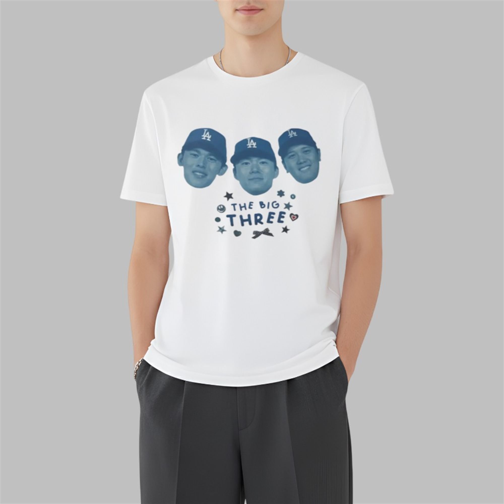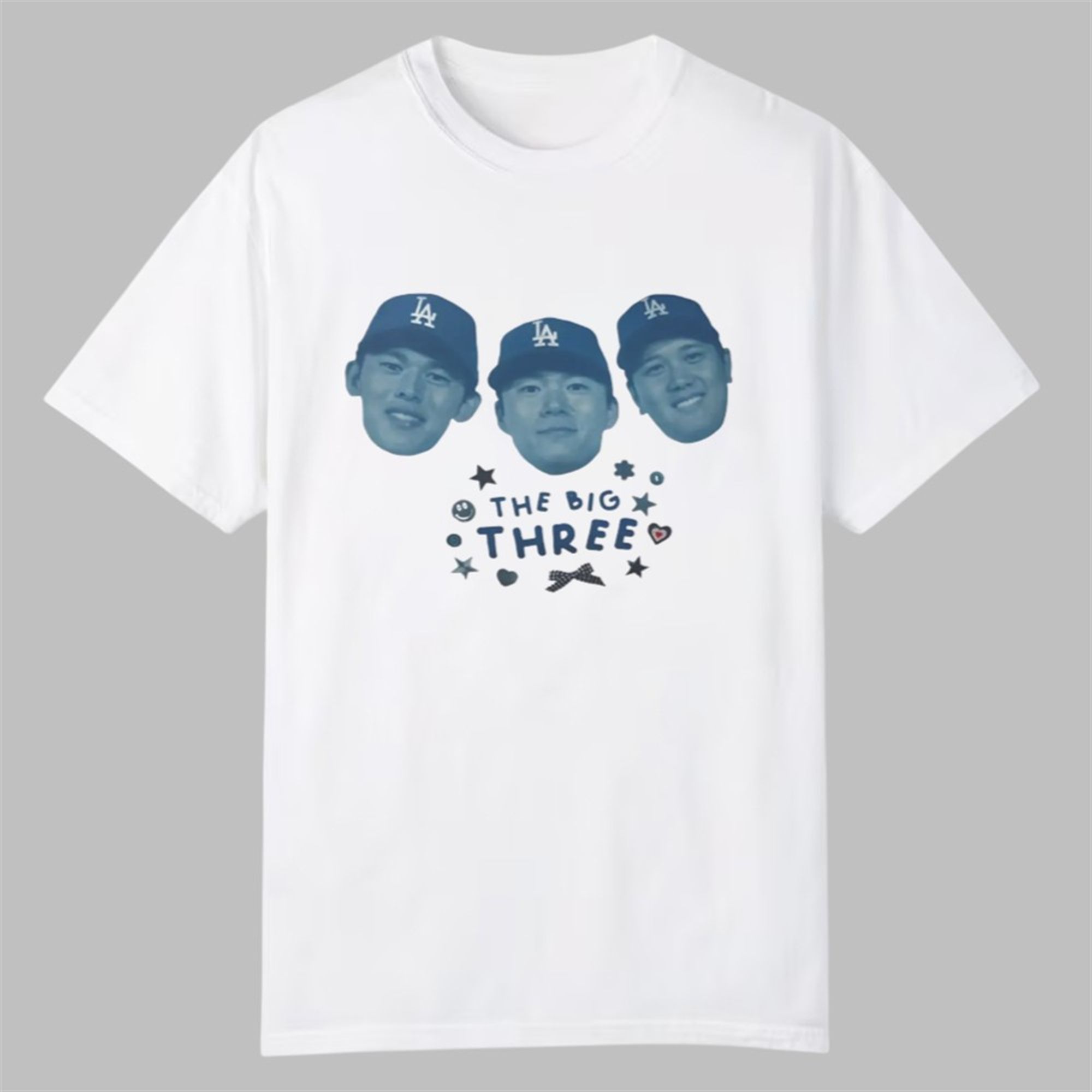 When Los Angeles assembled this legendary roster, the world knew something special was brewing. This shirt captures the fan-fueled excitement of that journey. It moves beyond standard team logos, offering a unique, stylized design that celebrates the personalities who defined the season. The front features playful, custom-illustrated portraits of Ohtani, Yamamoto, and Sasaki, all donning their iconic Dodgers caps. Below them, the text “THE BIG THREE” is rendered in a fun, hand-drawn-style font, complete with stars and hearts, capturing the genuine affection and global buzz surrounding these superstars.
