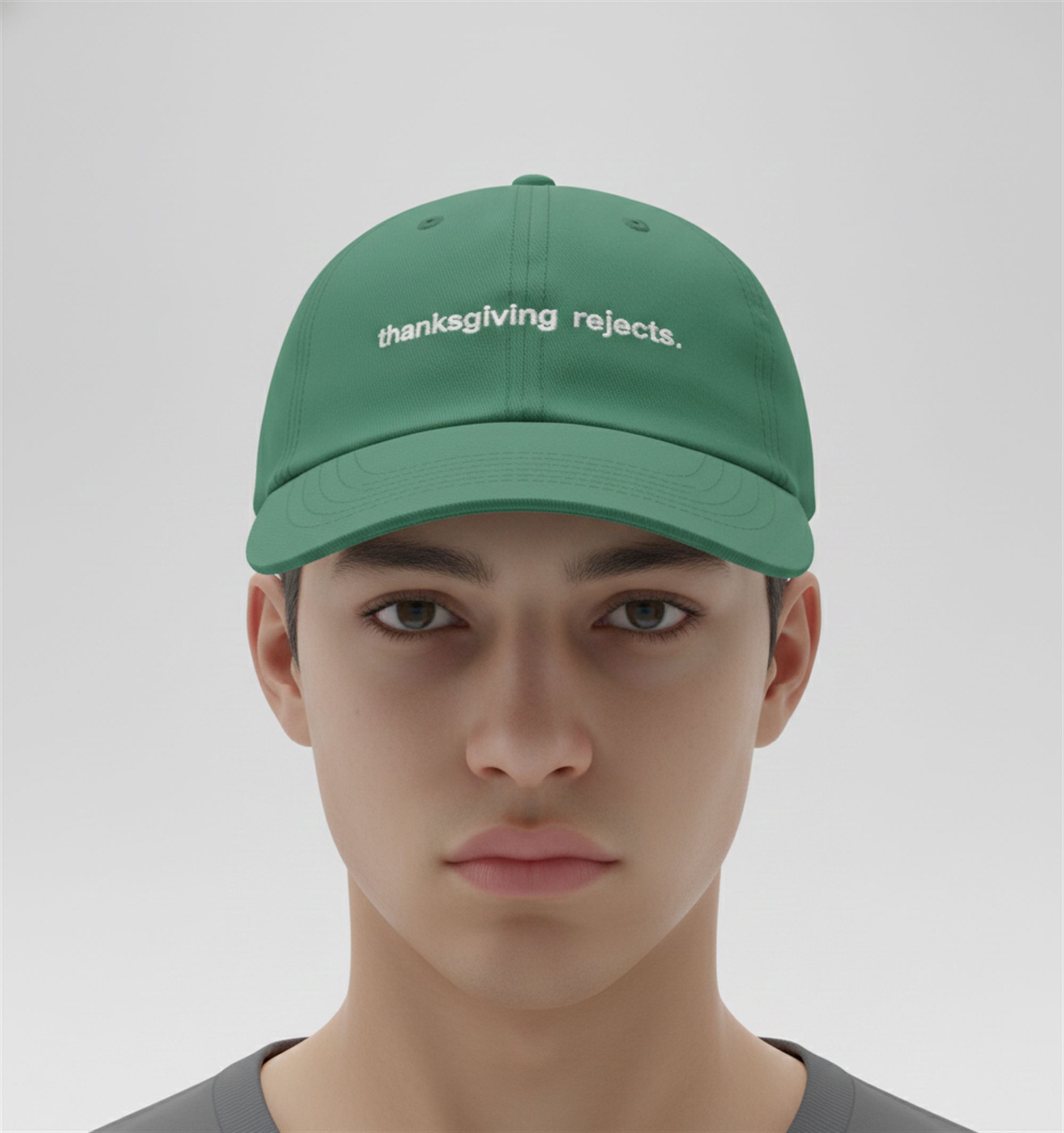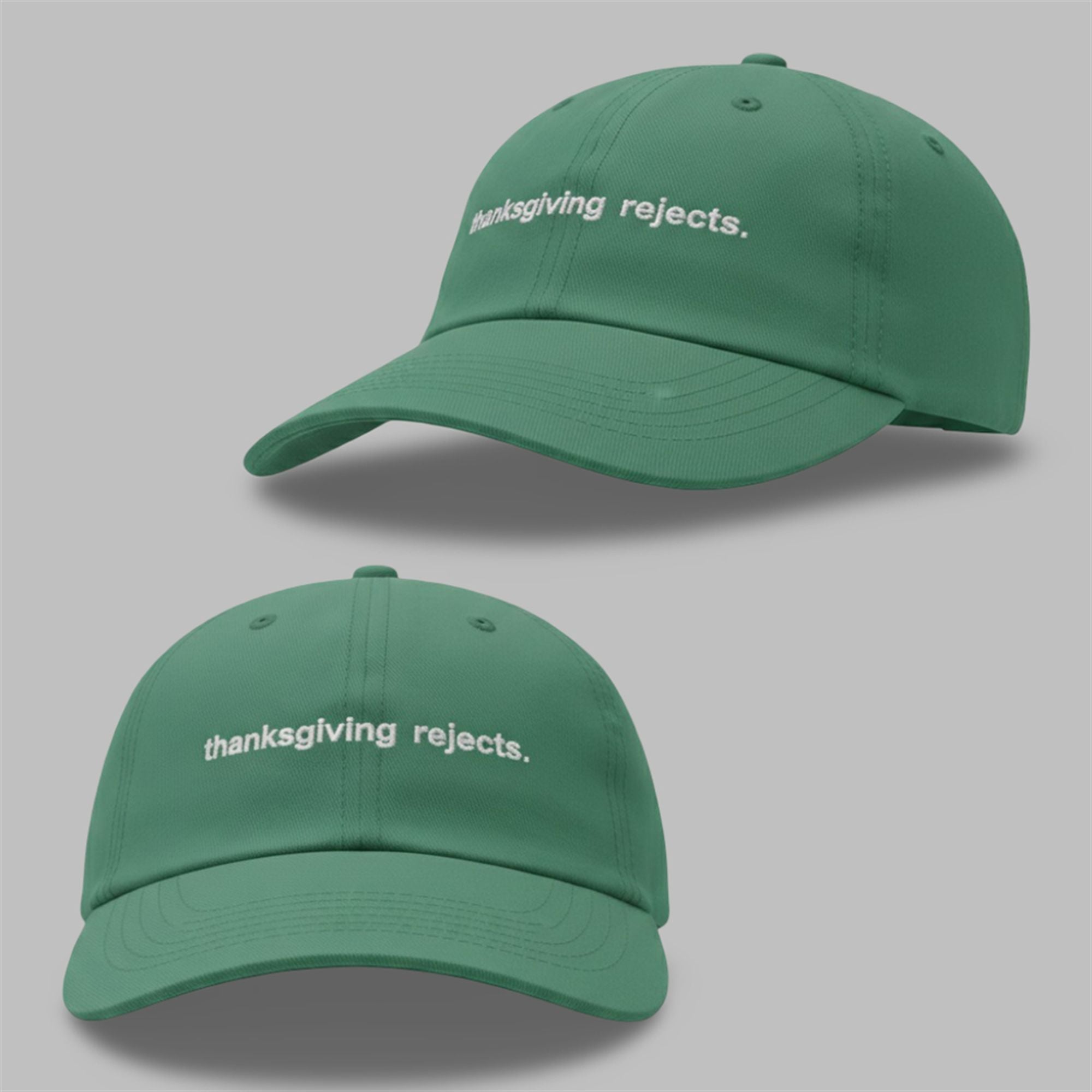 The text “Thanksgiving Rejects” in contrast stark white thread, utilizes a modern, sans-serif lowercase font. This “lowercase aesthetic” signals a laid-back, internet-native attitude that resonates deeply with the Gen Z and Millennial audience. The hat is precision, ensuring the text pops against the dark background without fraying or fading, keeping the message clear and bold.