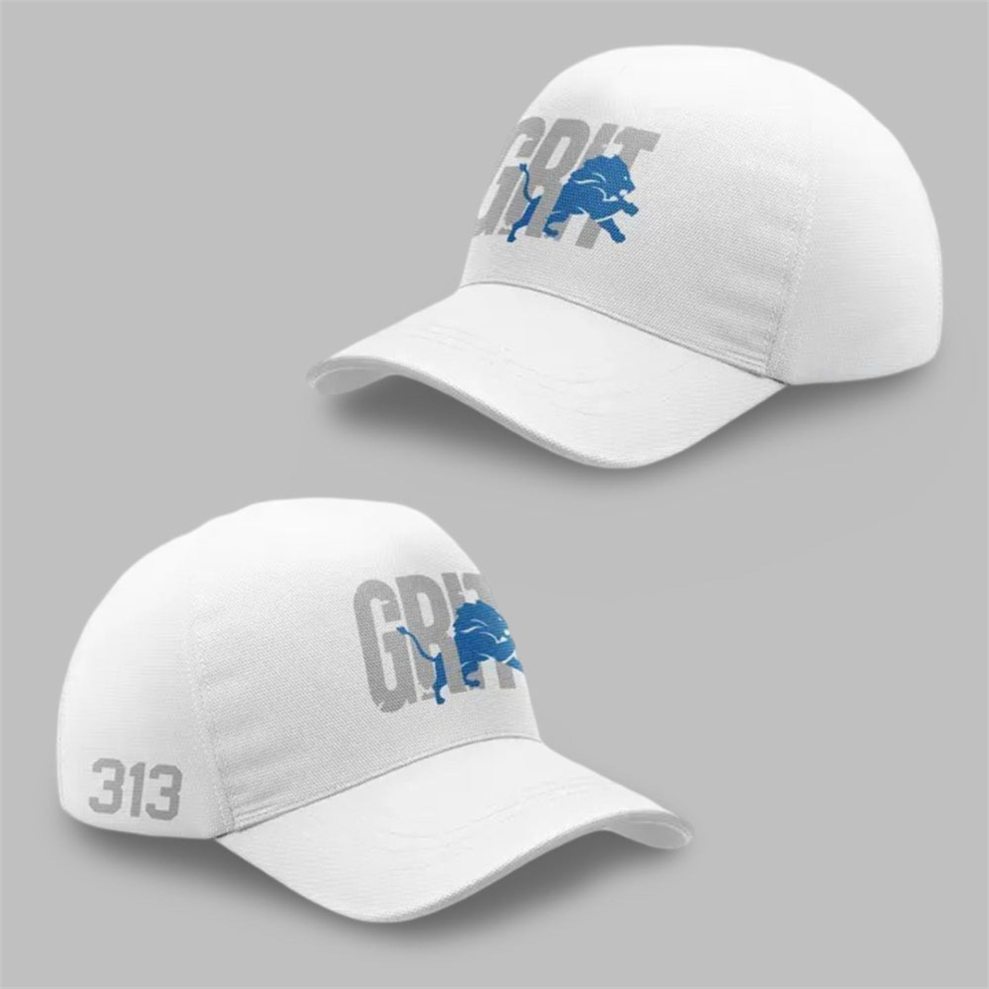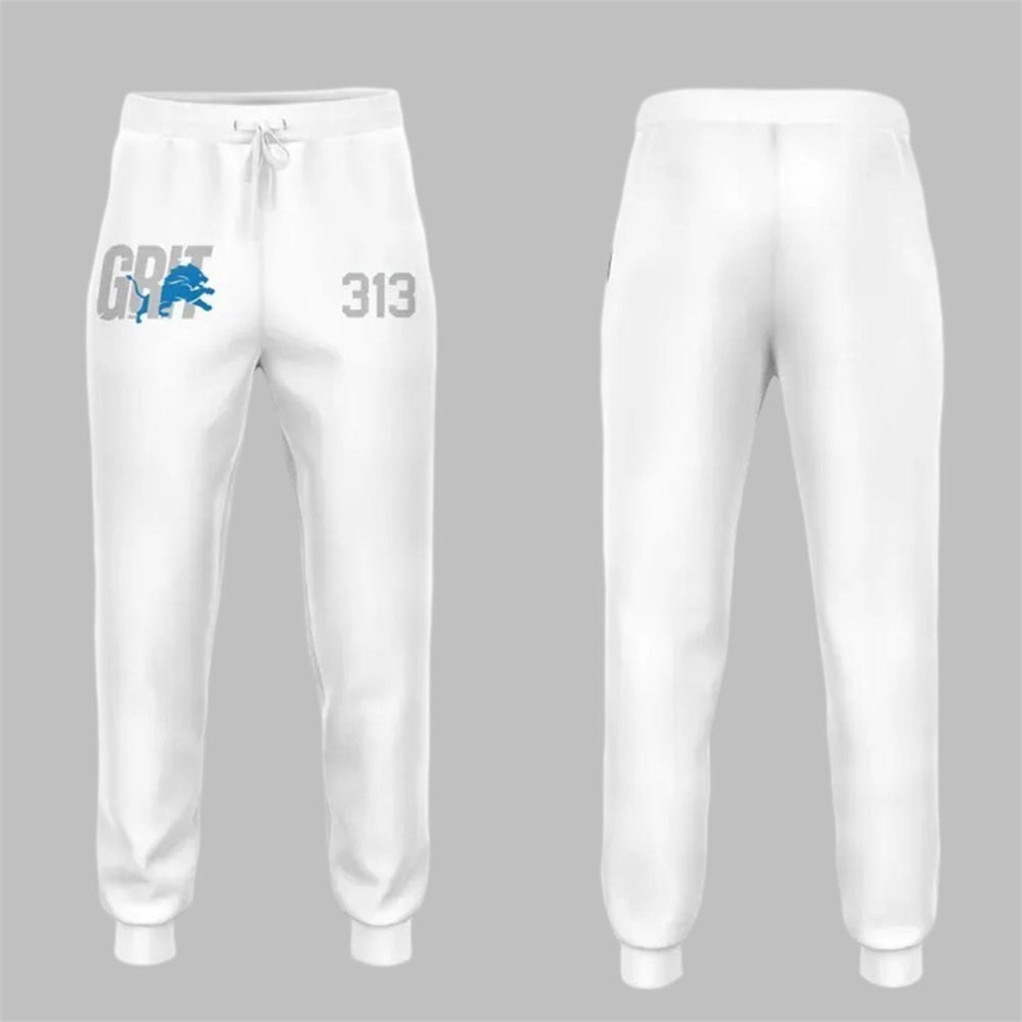 This isn’t a generic piece of merchandise; it is a specialized design for the 2025 season. The front of the hoodie showcases a large, grey, distressed “GRIT” typography that serves as the backdrop for the vivid Honolulu Blue leaping lion logo. It represents the rough, tough, and unstoppable nature of the team. The back of the hoodie is equally impressive, featuring a bold “DETROIT” banner, the “313” area code explicitly highlighting the city’s identity, and a secondary “GRIT” logo grounded by the team crest.
