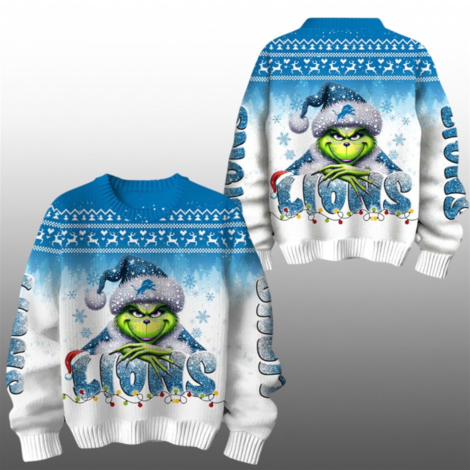 The design features a stunning winter gradient background, fading from deep Honolulu Blue to a snowy white. At the center, the Grnch smirks mischievously, donning a Santa hat emblazoned with the Detroit Lions logo. He leans over the word “LIONS,” rendered in a sparkling, icy font wrapped in festive Christmas lights. Topped off with classic Fair Isle patterns featuring reindeer and snowflakes, this sweater perfectly balances holiday tradition with aggressive team spirit.