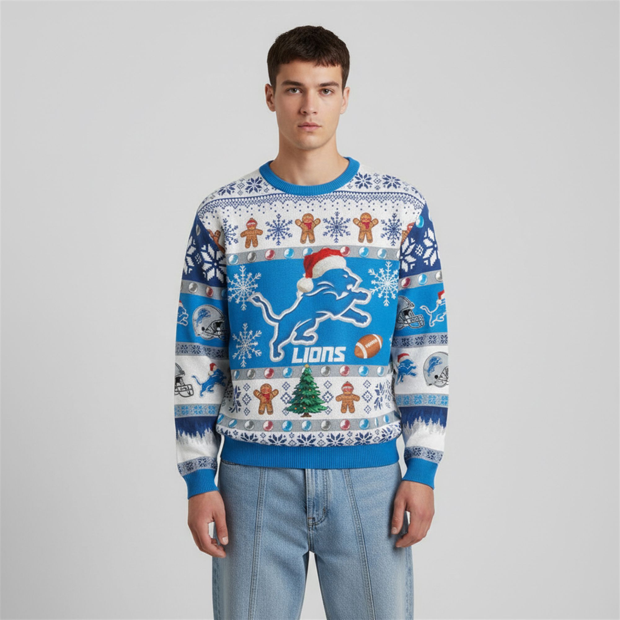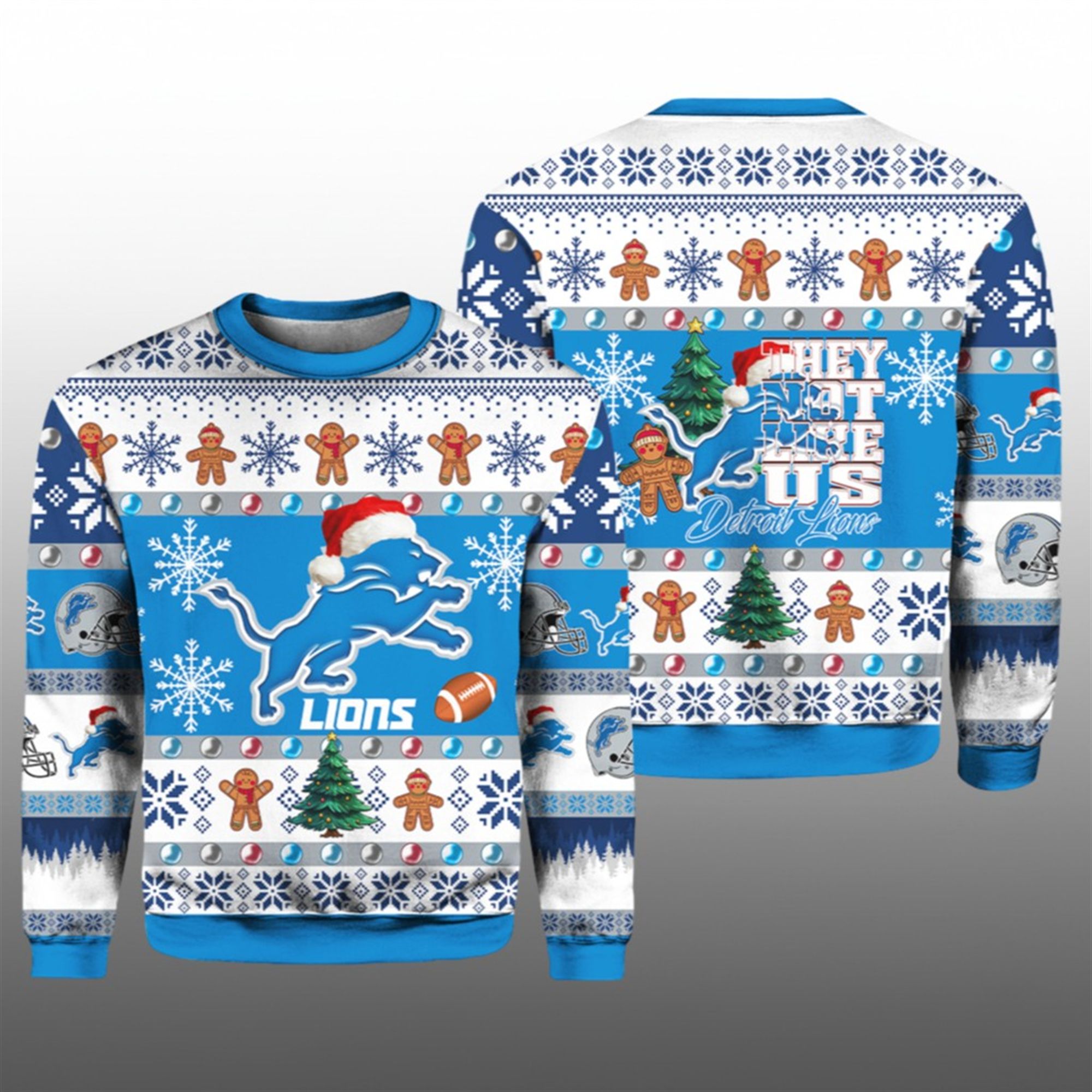 The design is a masterclass in fan service. The front showcases the roaring Lions logo donned in a festive Santa hat, surrounded by a winter wonderland of snowflakes, football helmets, and gingerbread men. The back of the sweater drives the message home with the bold text “THEY NOT LIKE US” overlaid on the Lions‘ silhouette. It taps into the massive pop-culture momentum of 2025, effectively bridging the gap between music, memes, and sports.