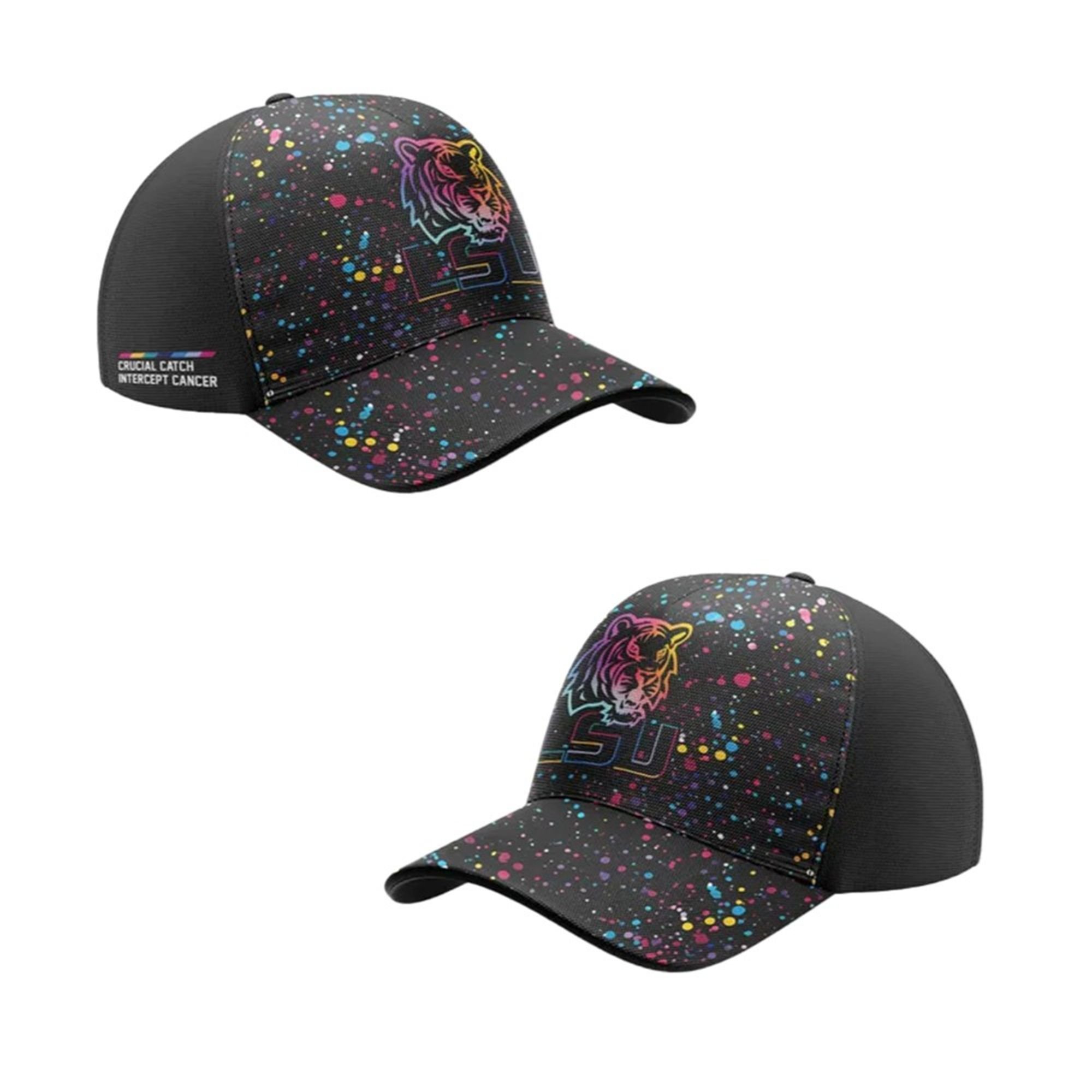 Stand out in any crowd with a design that’s as bold and resilient as the team it represents. The 2025 edition features a striking black base adorned with a multi-colored paint splatter effect, incorporating hues of teal, pink, purple, and yellow that symbolize the fight against various forms of cancer. The iconic LSU Tiger head logo is emblazoned on the front, rendered in a stunning, high-density embroidered outline with vibrant, neon-style colors that pop against the dark background.