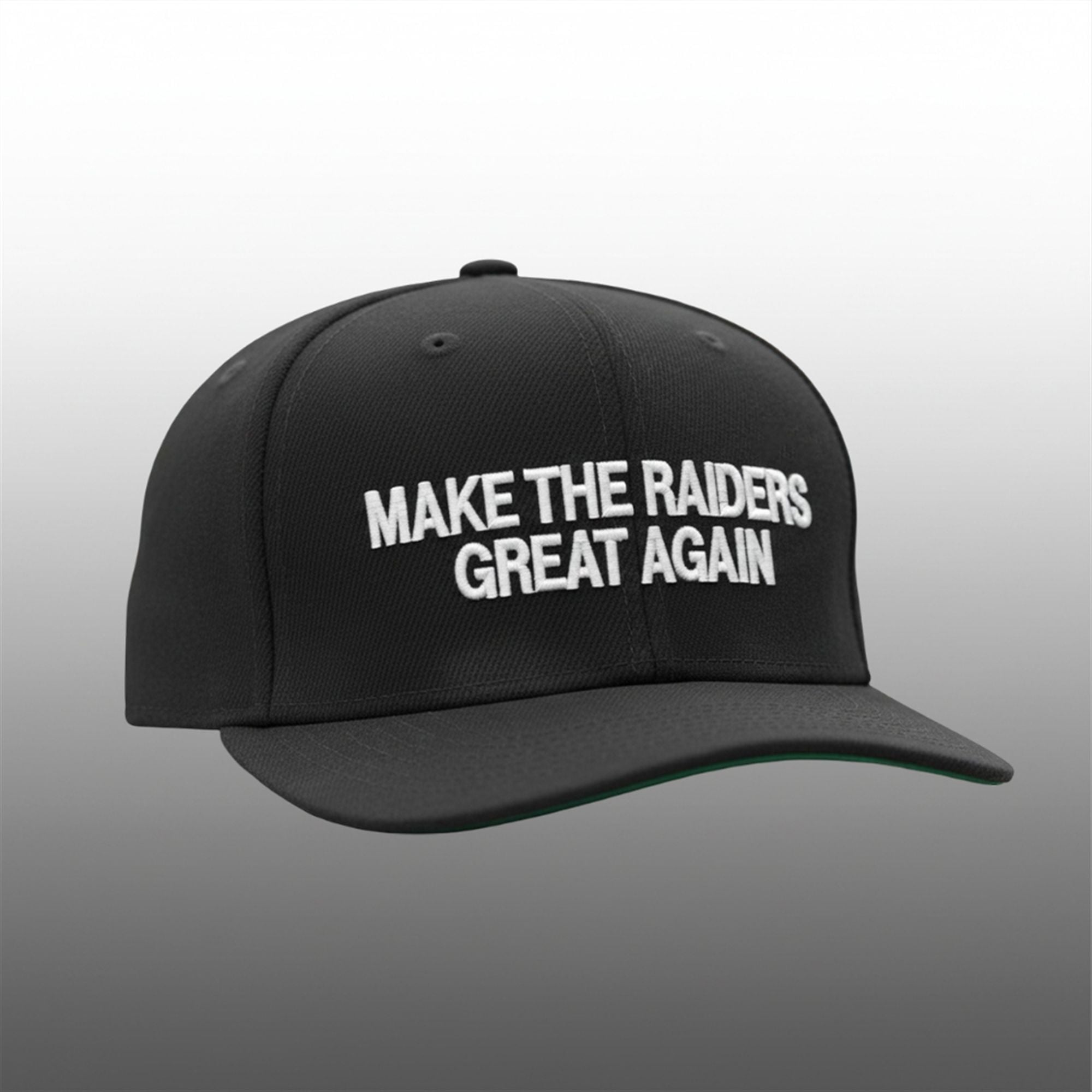Constructed with a structured crown and a classic flat or slightly curved brim, this cap features the slogan “MAKE THE RAIDERS GREAT AGAIN” in bold, high-contrast white against a deep black background. It perfectly captures the current sentiment of the fanbase—frustrated with the current record but endlessly hopeful for a return to the dominant “Just Win, Baby” era.