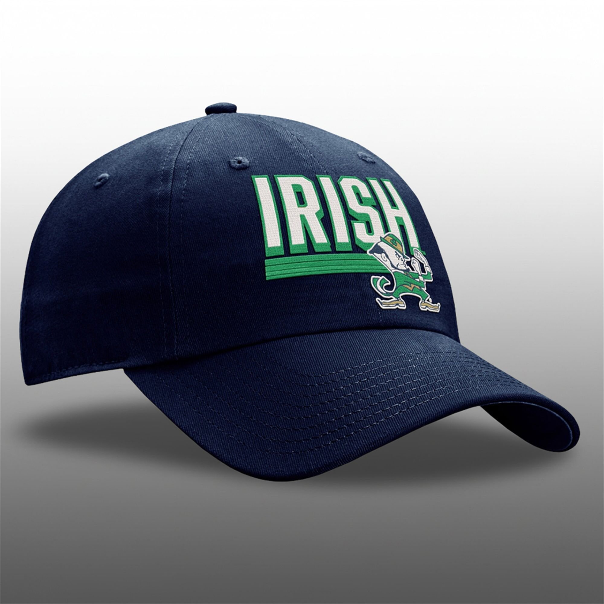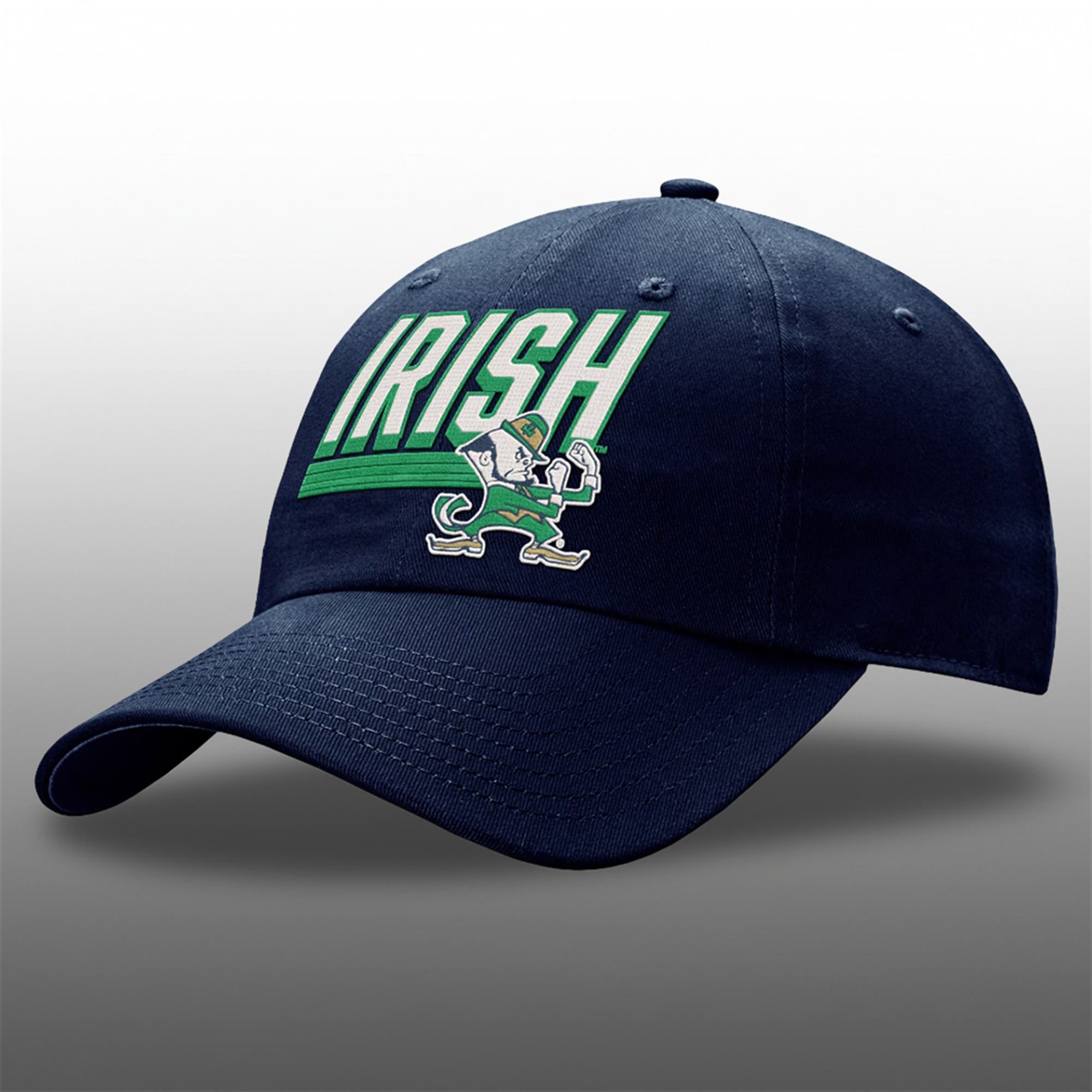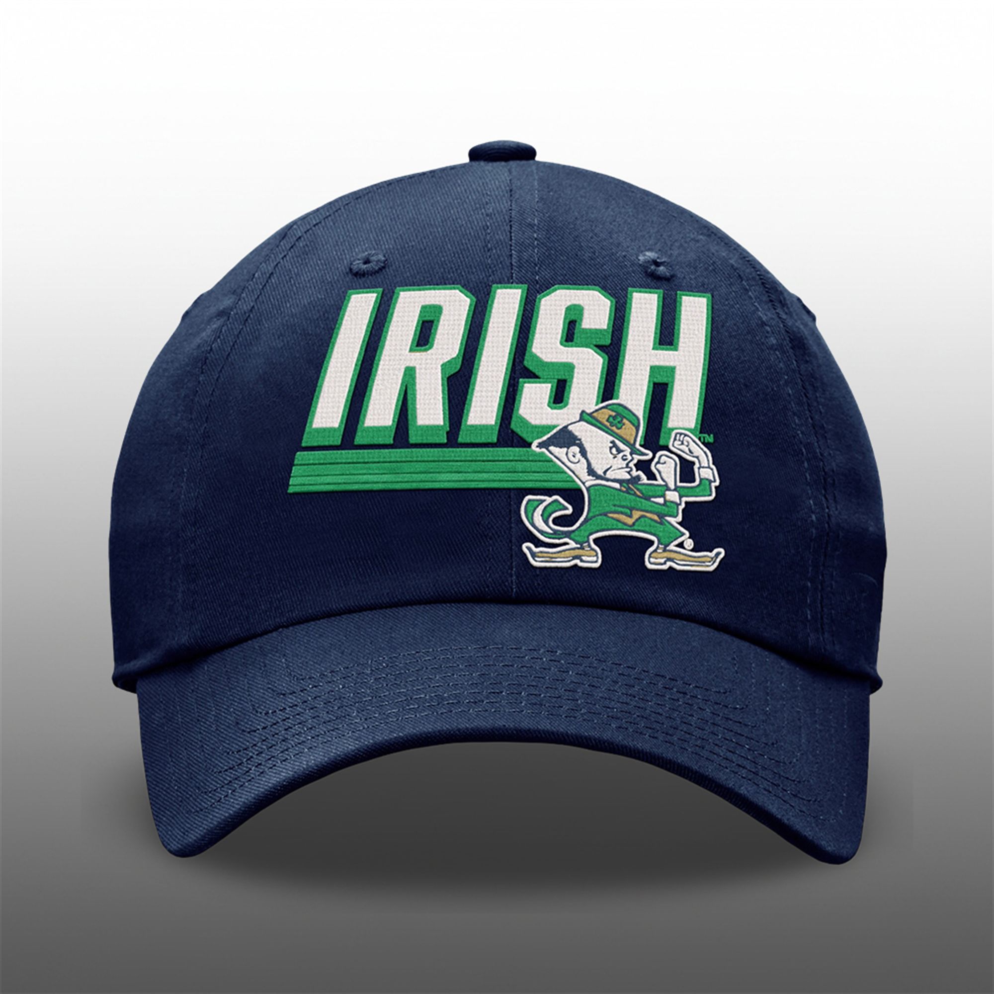 The front panel features the iconic, quality of the fighting leprechaun, mid-stride, perfectly capturing the team’s fighting spirit. Above him, the word “IRISH” is stitched in bold, athletic block letters, set off by two vibrant green stripes for a modern, energetic look.