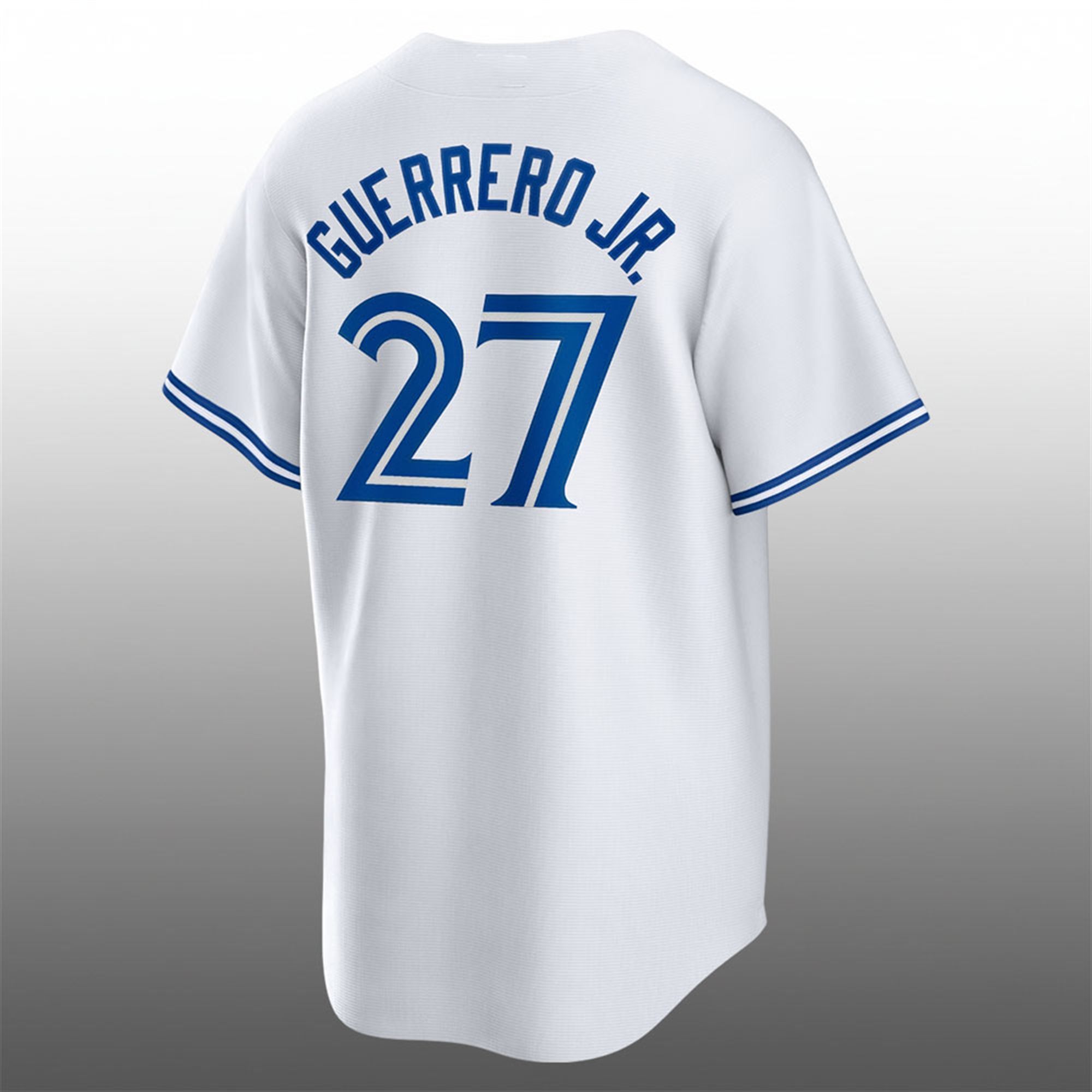 This style home jersey is identical to the one Vladdy wore at Rogers Centre while launching towering home runs and leading his team through the Fall Classic. It features the iconic “Blue Jays” script across the chest, with Vladdy’s legendary “GUERRERO JR.” name and “27” on the back in high-quality, professional-grade twill lettering.