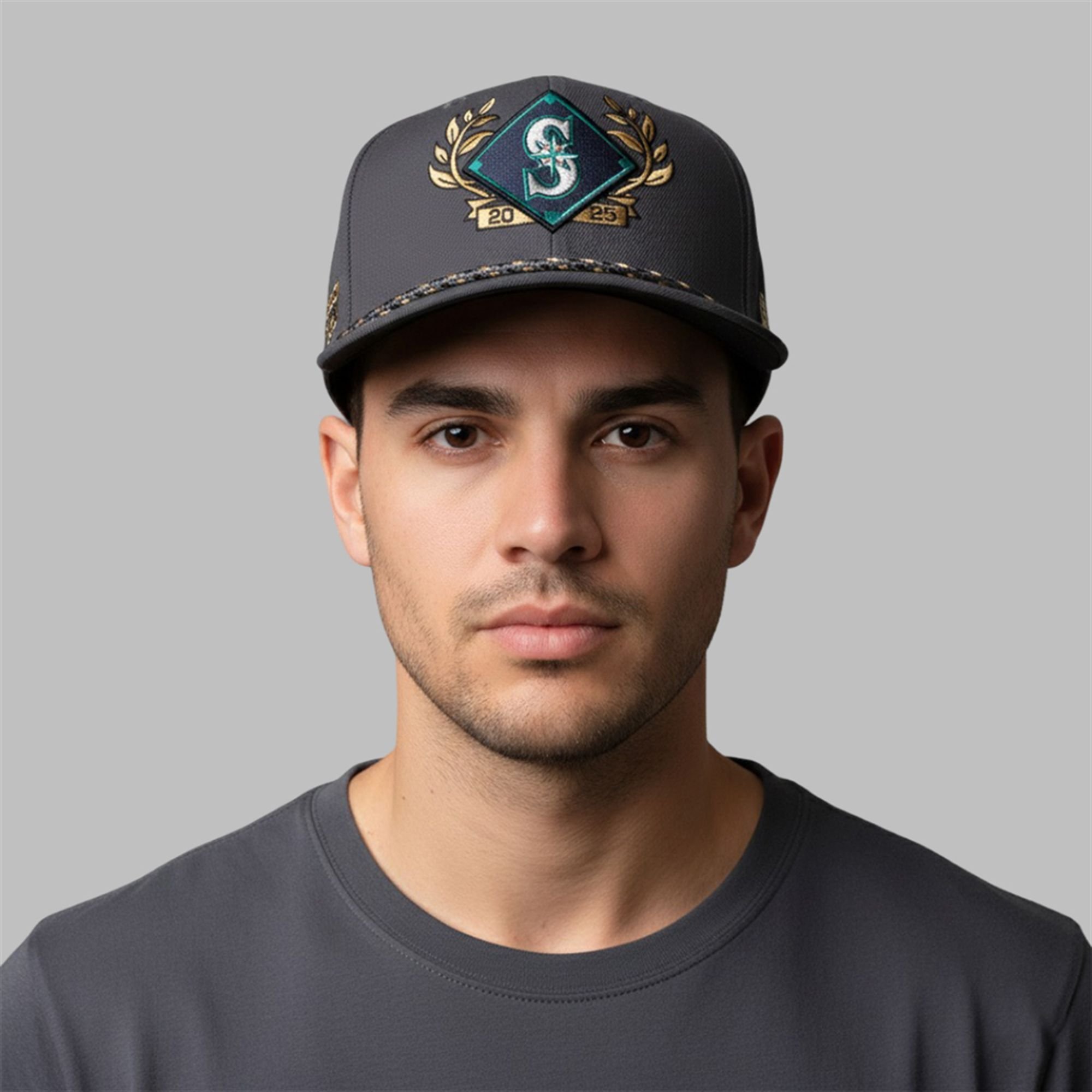 Capture the electric atmosphere of the Postseason with 2025 Seattle Mariners ALCS Bound Cap that stands for excellence. The foundation of the hat is a sleek, structured crown in a modern charcoal gray, offering a bold canvas for the commemorative emblems. Front and center is the iconic Mariners “S” compass rose logo, intricately in the team’s signature Northwest Green and silver. This emblem is framed by a regal, diamond-shaped crest and flanked by two golden laurel wreaths, symbolizing victory and the immense achievement of reaching the American League Championship Series. Below, a banner proudly displays “20” and “25,” forever marking this historic year in franchise history.