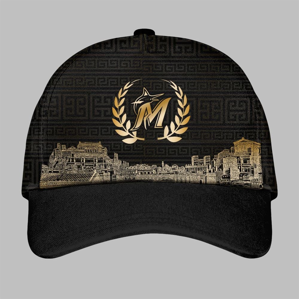The matching cap completes this powerful ensemble. It features the stylized “M” logo, intertwined with a marlin silhouette and crowned by a golden laurel wreath. The same ancient cityscape is rendered in gold across the front panels, tying the entire look together under a solid black brim.