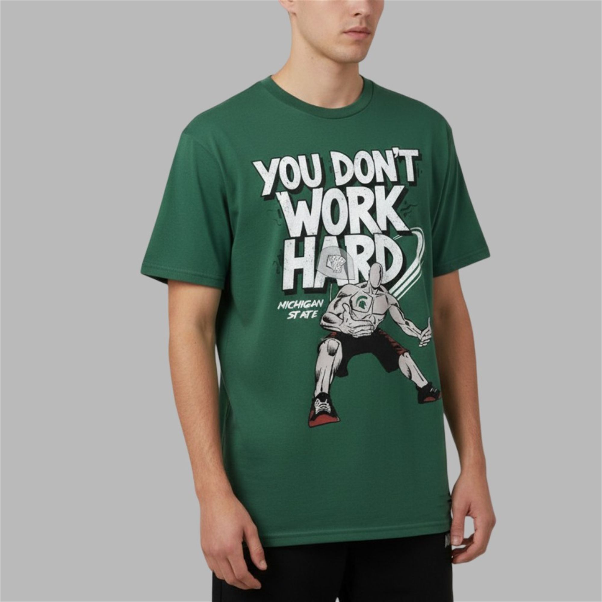 Visually, the shirt features a distressed, vintage-inspired graphic of a muscular, intense Spartan hooper in a defensive stance, embodying the physical dominance Michigan State is famous for. The slogan “YOU DON’T WORK HARD” is emblazoned in bold, grunge-style typography, serving as both a taunt to the opposition (“soft” teams) and a self-affirming mantra for the Spartan faithful.
