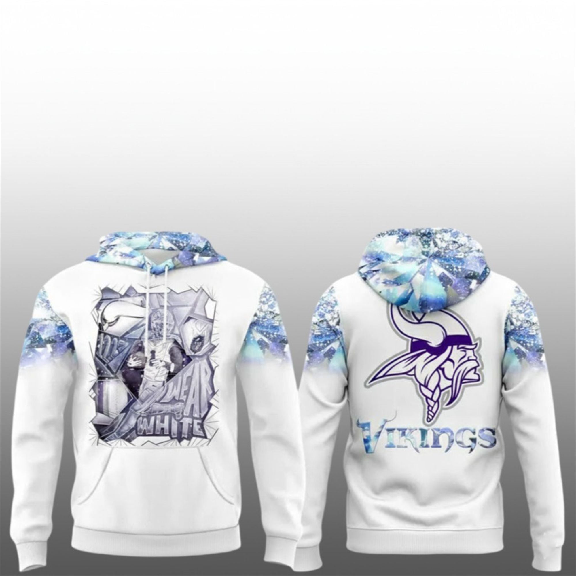 The front of the hoodie showcases an aggressive, stylized graphic of a Vikings playmaker breaking through a wall of ice, framed by shards of frozen glass and the rallying cry: “WEAR WHITE.” The hood itself features a unique, crystalline texture pattern in cool blues and purples, simulating the look of glacial ice. On the reverse, the classic Norseman logo is reimagined with a frost-bitten texture, sitting proudly above a stylized “VIKINGS” wordmark that looks carved from an iceberg.