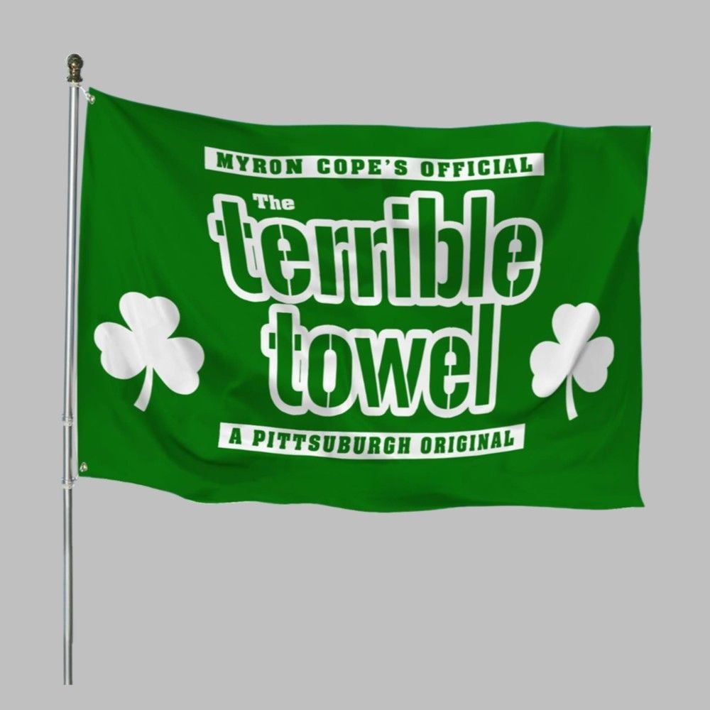 For decades, Myron Cope’s Official “The Terrible Towel” has been the undisputed symbol of the Pittsburgh Steelers’ grit, determination, and championship legacy. It’s a piece of sports history, waved by millions to rally the team to victory. For 2025, we’ve infused this “Pittsburgh Original” with the spirit of the Emerald Isle. This flag features the classic, bold “Terrible Towel” text on a vibrant, lucky green background. Flanked by two prominent shamrocks, the design masterfully blends the tough-as-nails attitude of Pittsburgh with the festive, welcoming spirit of Ireland. It’s a powerful visual statement for every fan who believes in tradition, passion, and a little bit of luck.