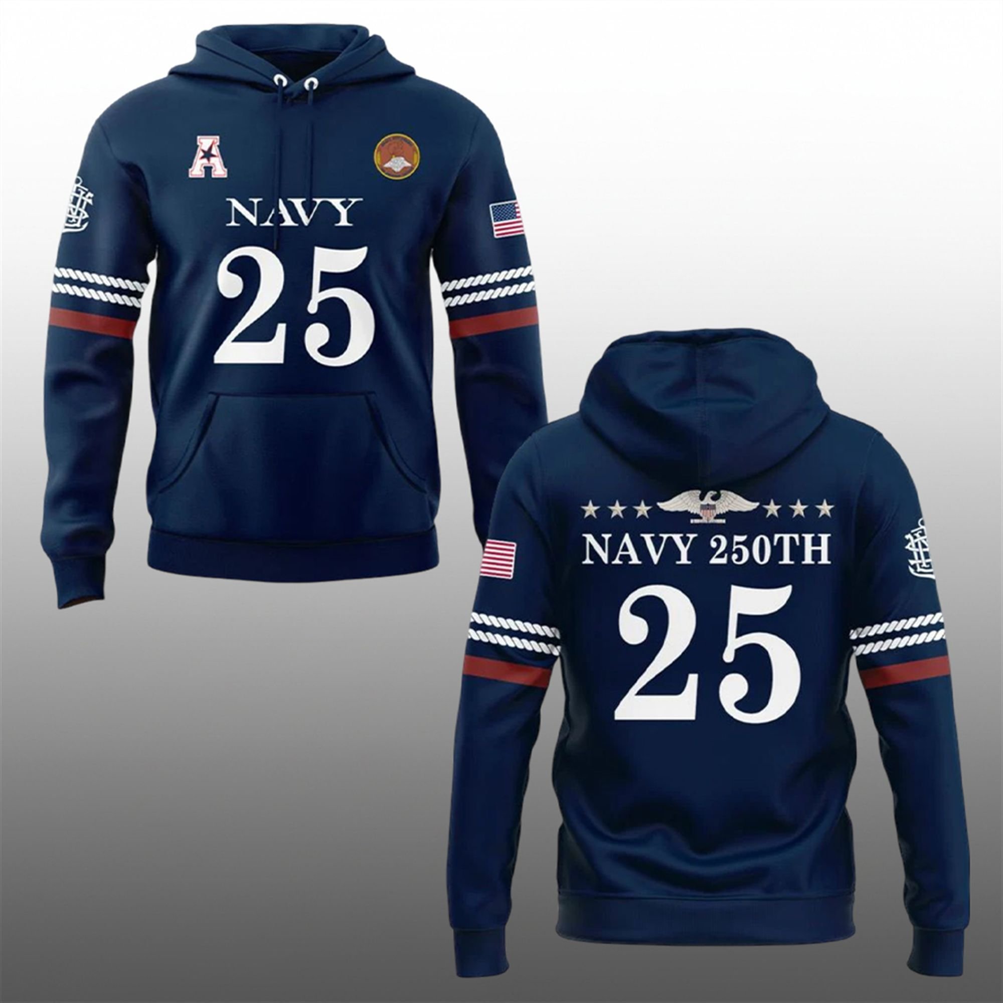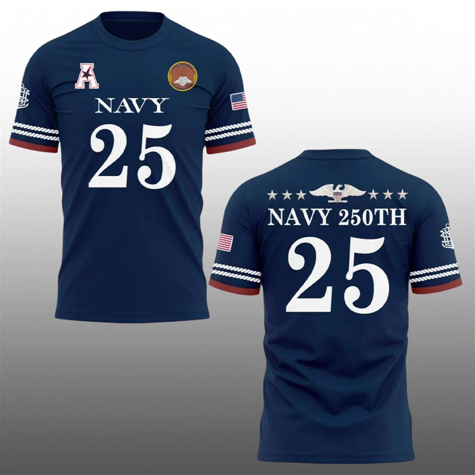 The back of the shirt is equally striking. It showcases the text “NAVY 250TH” arching over a large number “25.” Above the text sits a magnificent, spread-winged Eagle and Stars graphic. This imagery is inspired by the stern decorations of early American warships, connecting the modern fan directly to the age of sail.