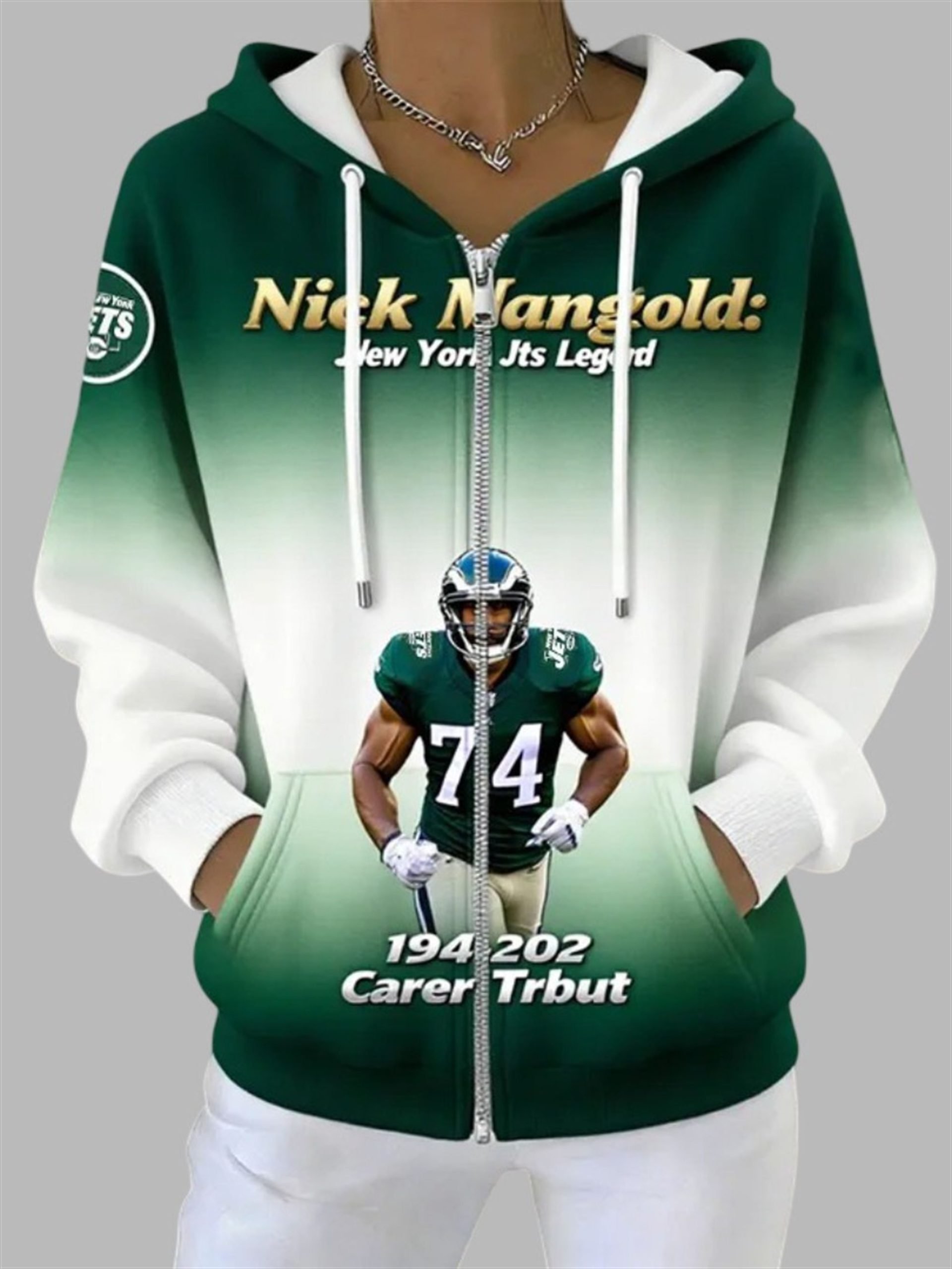 This commemorative zip-up captures the essence of his career. The design features a powerful image of Mangold in his iconic #74 jersey, set against the Jets’ signature green and white. The bold text “Nick Mangold: New York Jets Legend” and the poignant “Career Tribute” inscription make this a definitive piece of memorabilia. It’s a somber but proud celebration of a player who defined toughness and gave his all for the team and the city he loved.