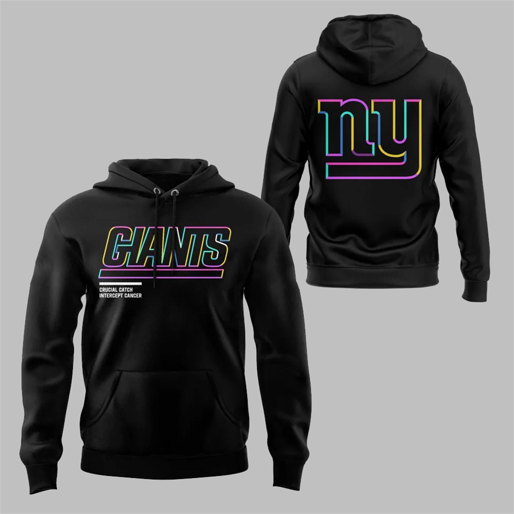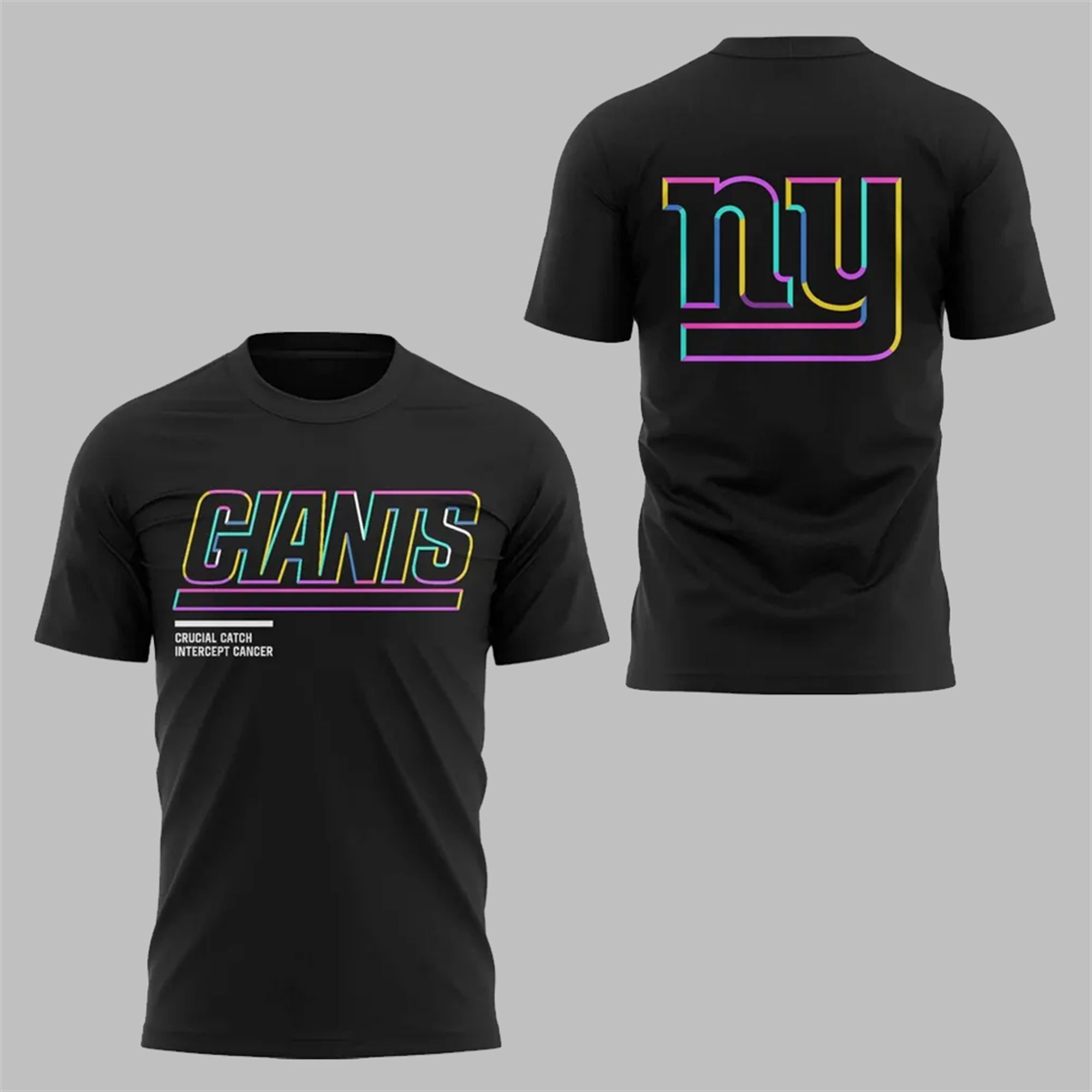As a member of the Big Blue family, your passion is undeniable. Now, you can channel that energy into something truly meaningful. This t-shirt proudly displays the iconic “GIANTS” wordmark on the front and the classic “ny” logo on the back, both rendered in an electrifying, multi-color neon outline. The vibrant hues of pink, yellow, blue, and purple represent the unity required to fight all forms of cancer. Below the main graphic, the powerful message “CRUCIAL CATCH INTERCEPT CANCER” serves as a constant reminder of the shirt’s purpose, aligning your fandom with the commitment to the American Cancer Society.