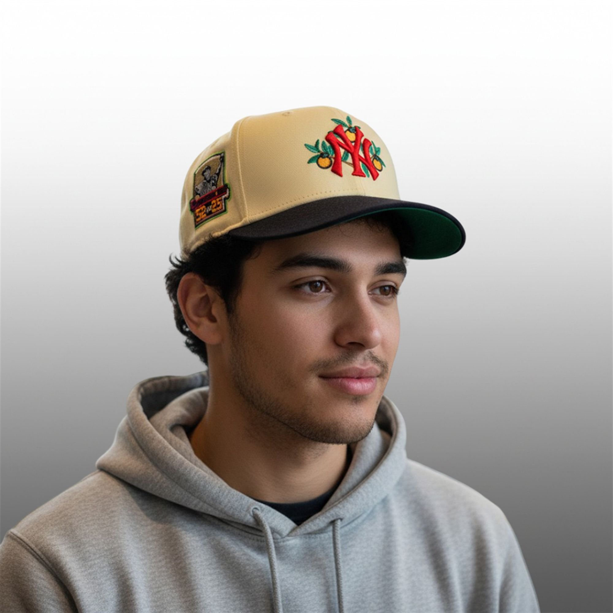 The centerpiece of this design is the re-imagined New York Yankees Logo. The iconic “NY” is in bold red, intricately interlaced with vibrant citrus branches and fruit (a nod to the Grapefruit League springs or the “sweet” taste of victory). On the side, the highly detailed “52 in 25” Commemorative Patch features a silhouette of Sabathia tipping his cap, immortalizing the moment he enters the Hall.