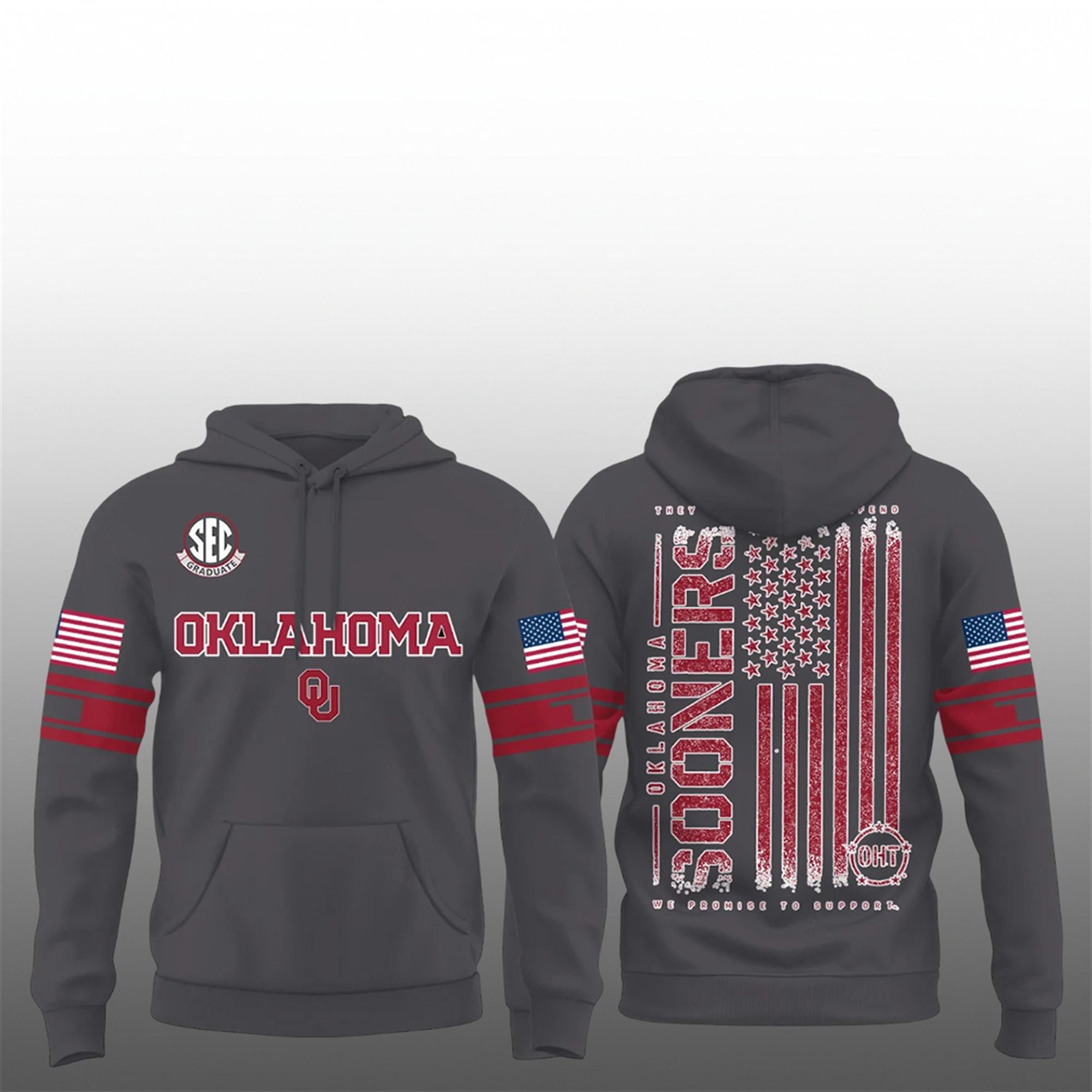 The back of the shirt delivers the emotional core of the design. It features a large, distressed vertical American flag graphic intertwined with “OKLAHOMA SOONERS” text. Framing the flag is the powerful Operation Hat Trick (OHT) inspired motto: “They Promised To Defend, We Promise To Support.” Finished with stylized American flag details on the sleeves and crimson banding on the collar and cuffs, this shirt is a masterclass in patriotic sports fashion.