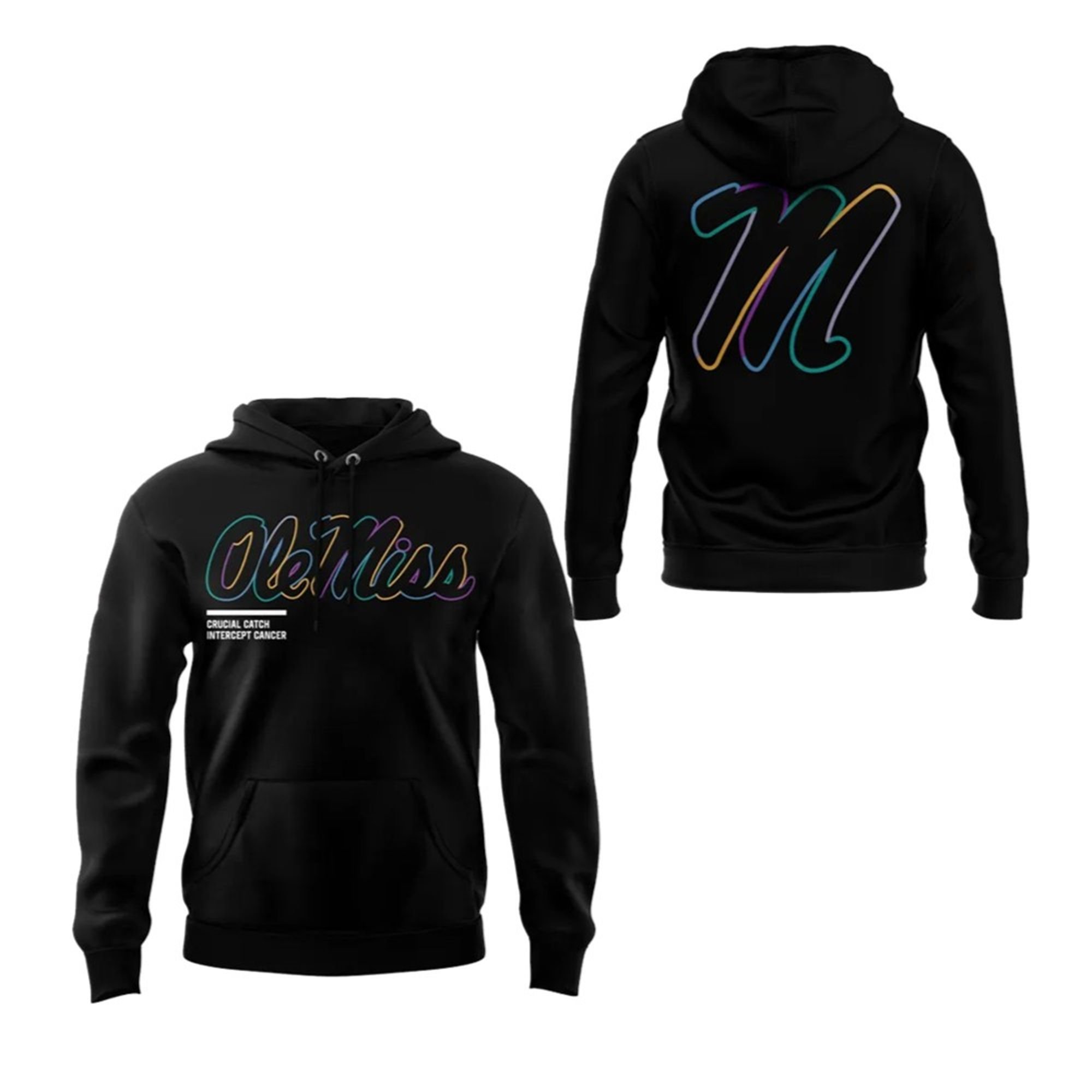 This hoodie is designed for the passionate members of the Ole Miss family—the students cheering from the stands, the proud alumni representing the red and blue across the country, and every fan whose heart beats with a “Hotty Toddy” chant. It’s more than just merchandise; it’s a wearable testament to the community’s commitment to the Crucial Catch mission. The front features a vibrant, multi-colored “Ole Miss” script, while the back boasts an oversized, stylized script “M” in the same eye-catching palette, ensuring your Rebels pride is visible from every angle.