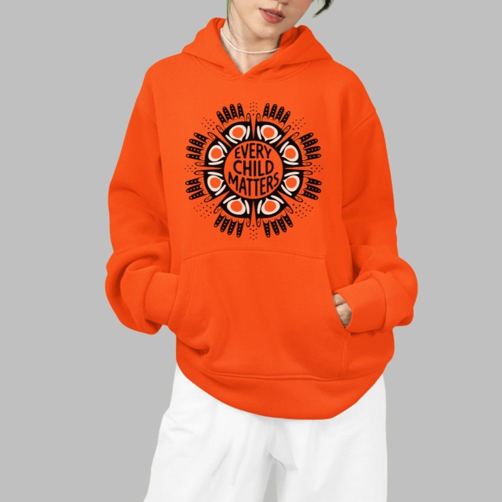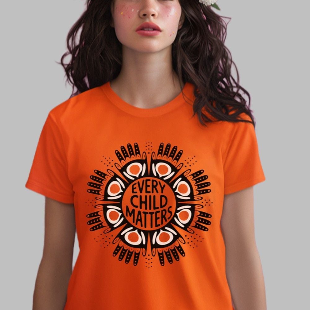 At the heart of this shirt is a stunning and intricate circular design inspired by Indigenous artistry. The central message, “EVERY CHILD MATTERS,” is encircled by symbols representing community, protection, and the interconnectedness of all people. The outward-facing hands symbolize reaching out for help, for healing, and for a brighter future, while also representing the generations impacted. The vibrant orange, black, and white colour palette is both striking and deeply symbolic, adhering to the spirit of Orange Shirt Day. This is not just a graphic; it’s a story of resilience, a call for justice, and a tribute to the enduring strength of Indigenous cultures. Wearing it is an act of bearing witness and a commitment to positive change.