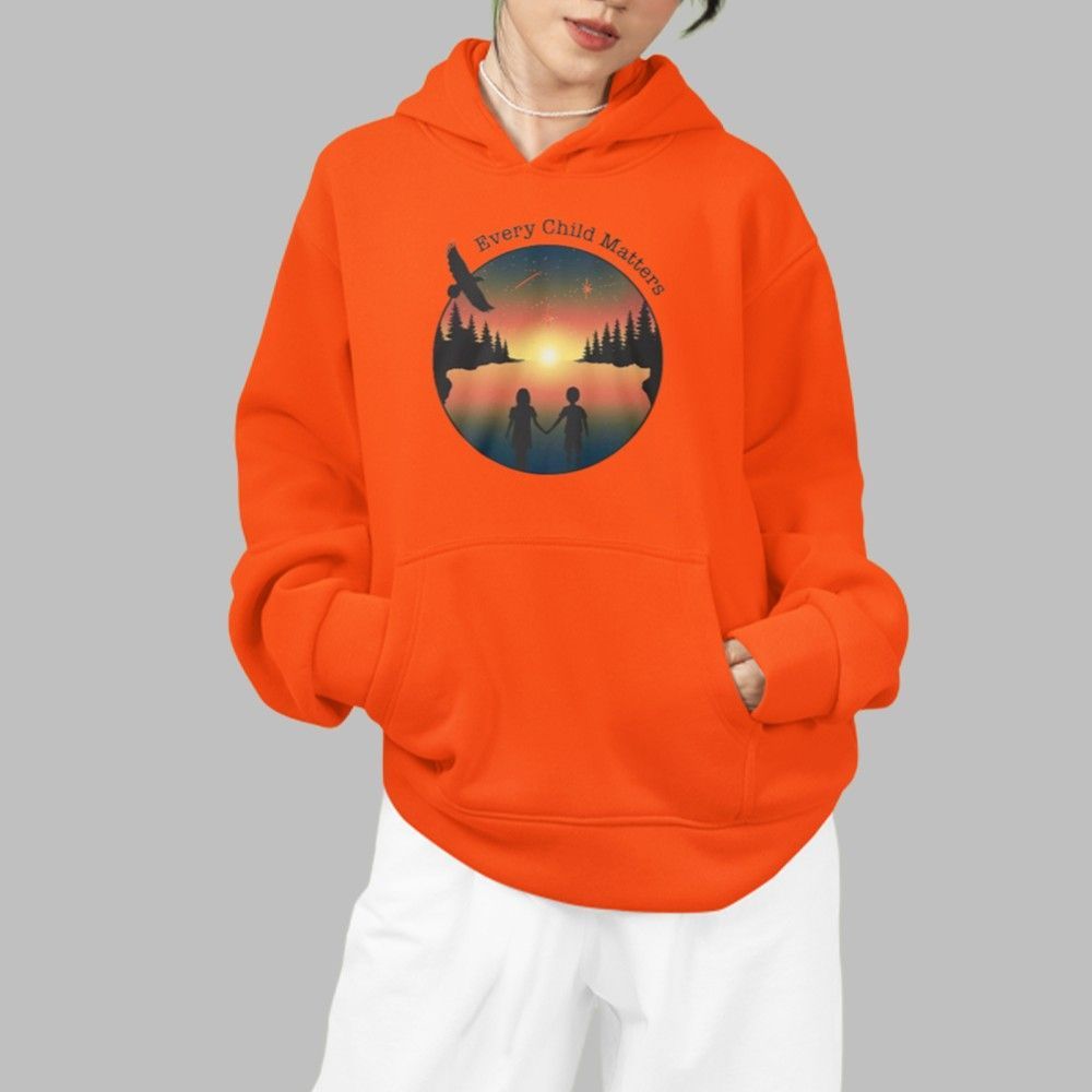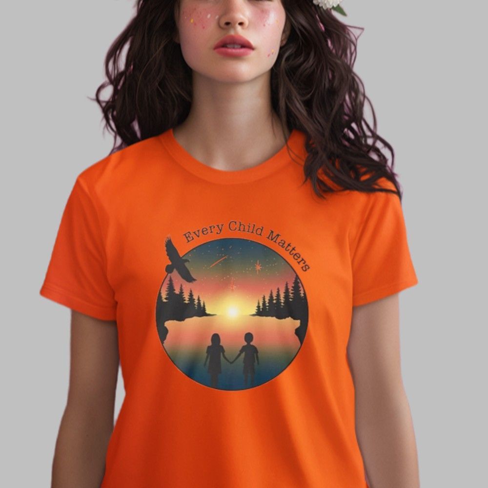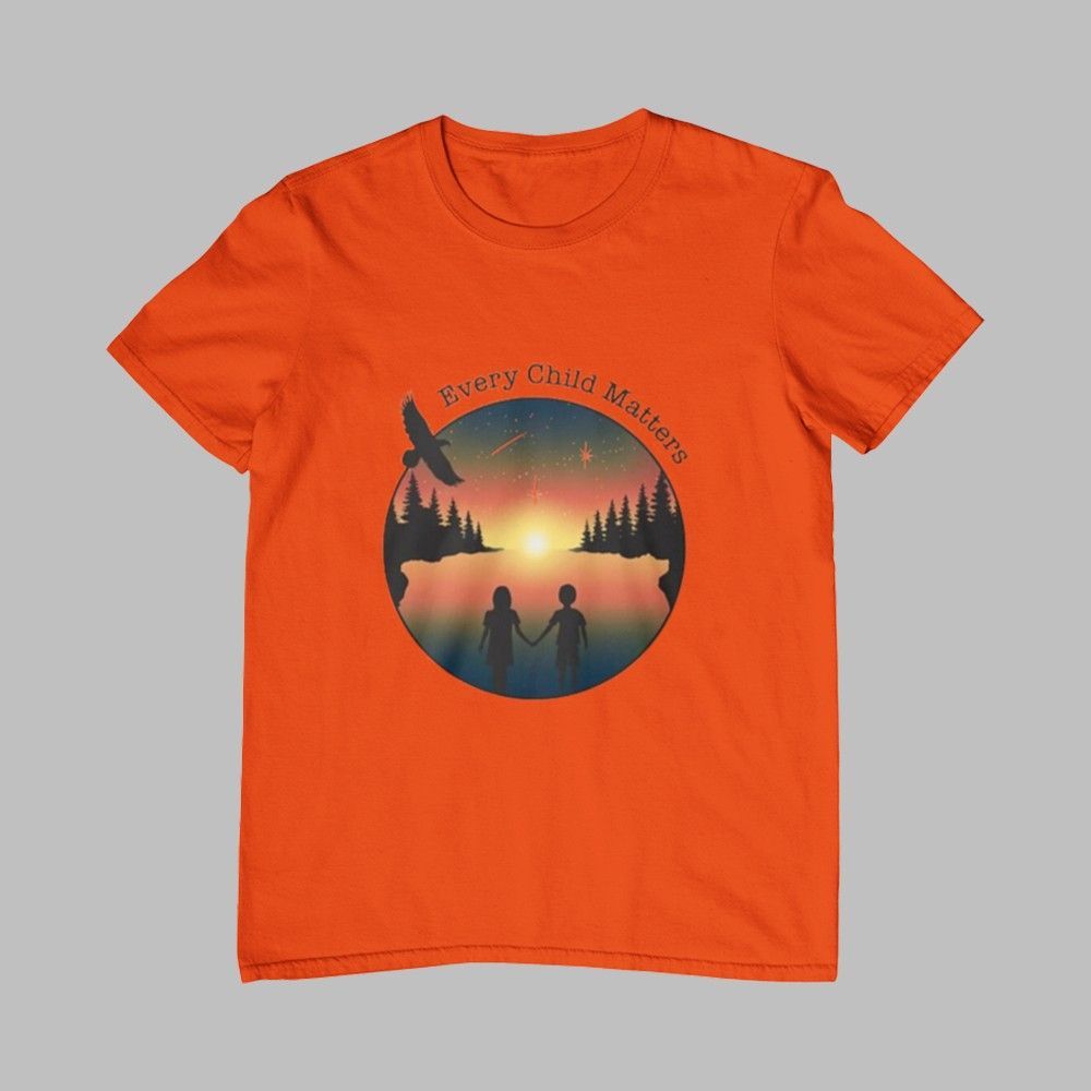 This 2025 Orange Shirt Day Every Child Matters Shirt is more than just an emblem; it’s a narrative of healing and resilience. It features two children holding hands, silhouetted against a beautiful sunset over a lake, with an eagle soaring overhead.