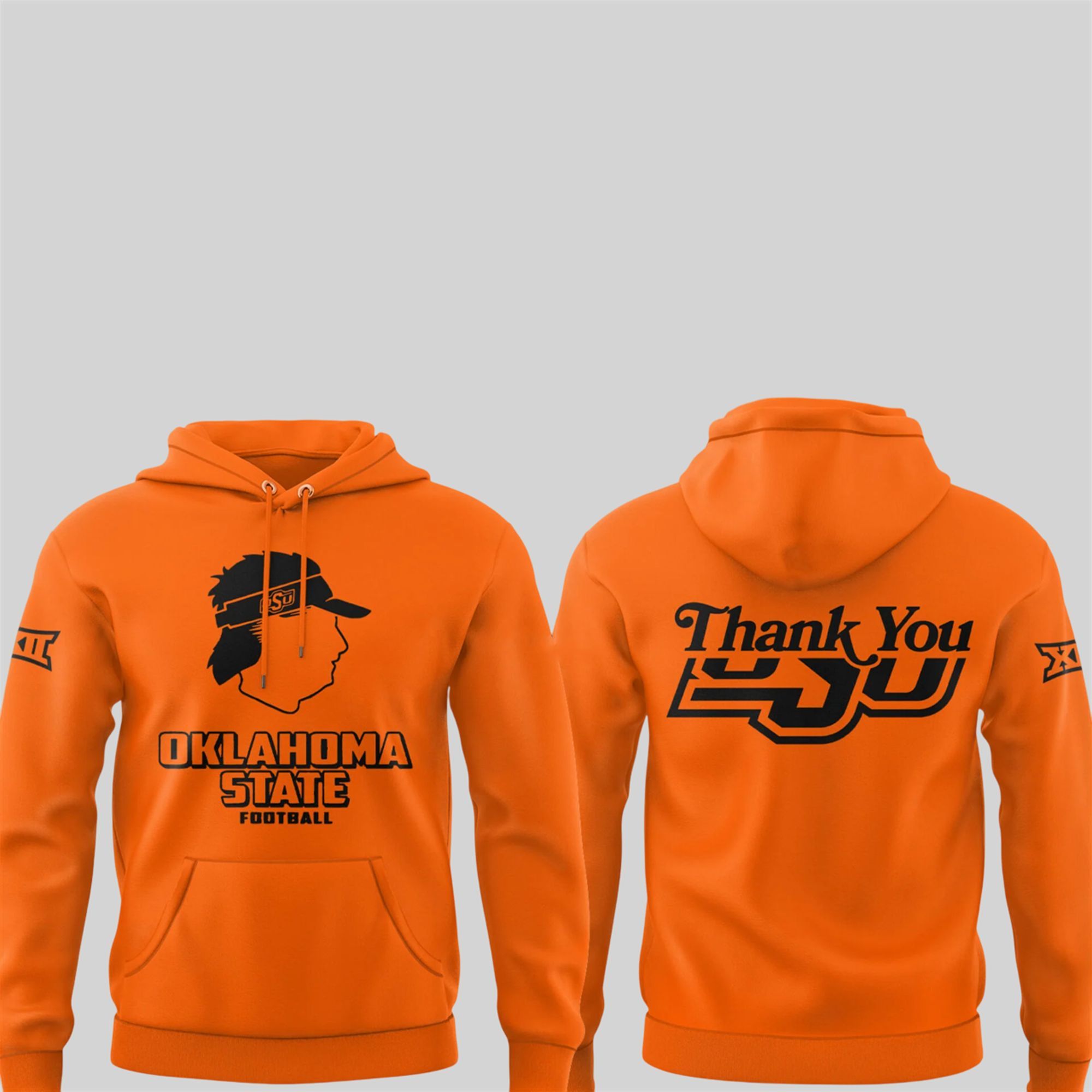 The back of the shirt delivers a clear and powerful message: “Thank You.” This is seamlessly integrated into a stylized OSU logo, creating a visually compelling and heartfelt tribute. To complete the authentic look, both sleeves are adorned with the Big 12 Conference logo, cementing this shirt as a premium piece of fan apparel perfect for the 2025 season and beyond.