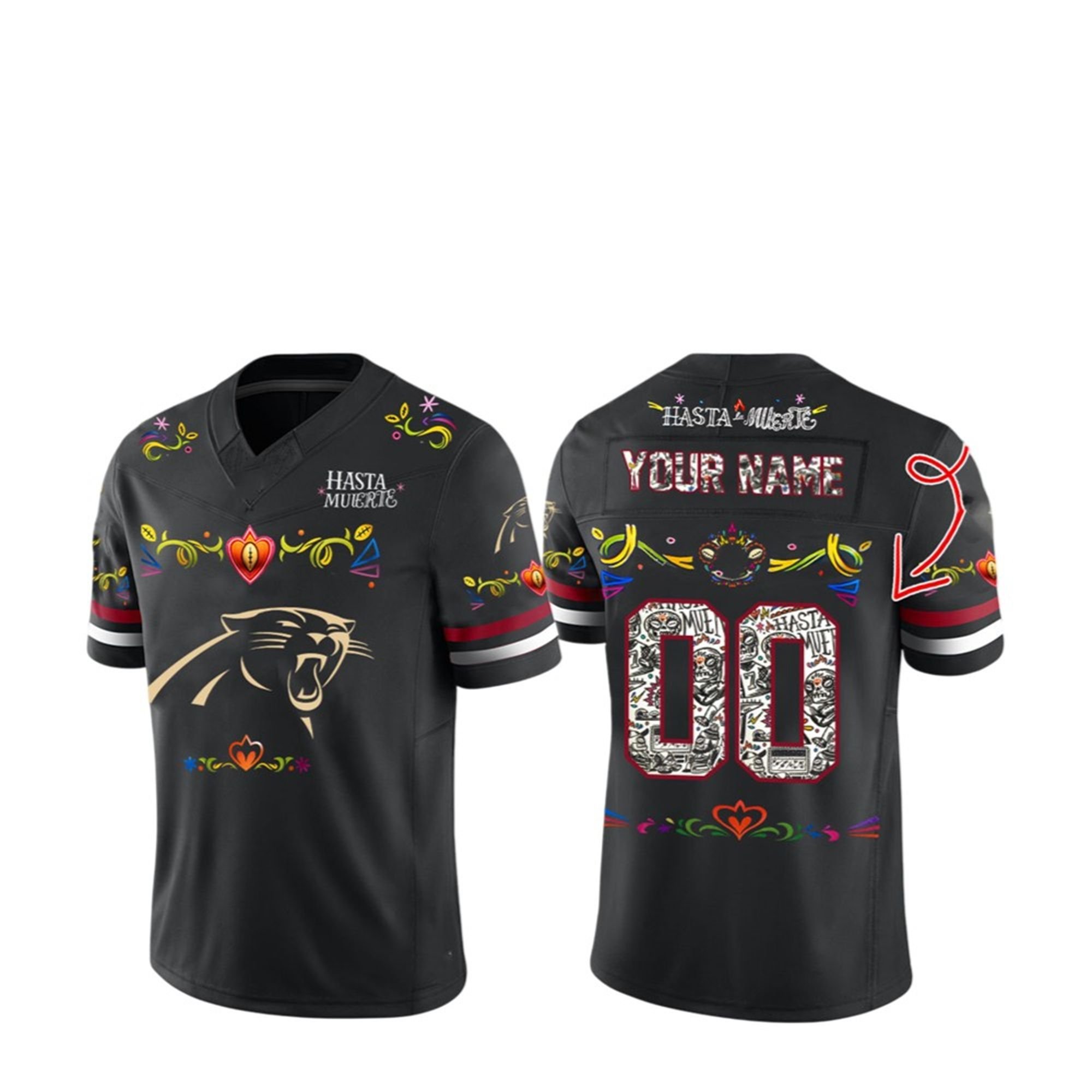 The “Hasta la Muerte” (Until Death) motto, emblazoned across the shoulders, sets the tone for a design that is deeply meaningful. It’s a declaration of unwavering support for the Panthers, perfectly mirroring the Día de Muertos belief in an unbreakable bond with those who came before. This jersey captures the essence of the celebration, transforming the classic football silhouette into a canvas of cultural expression.