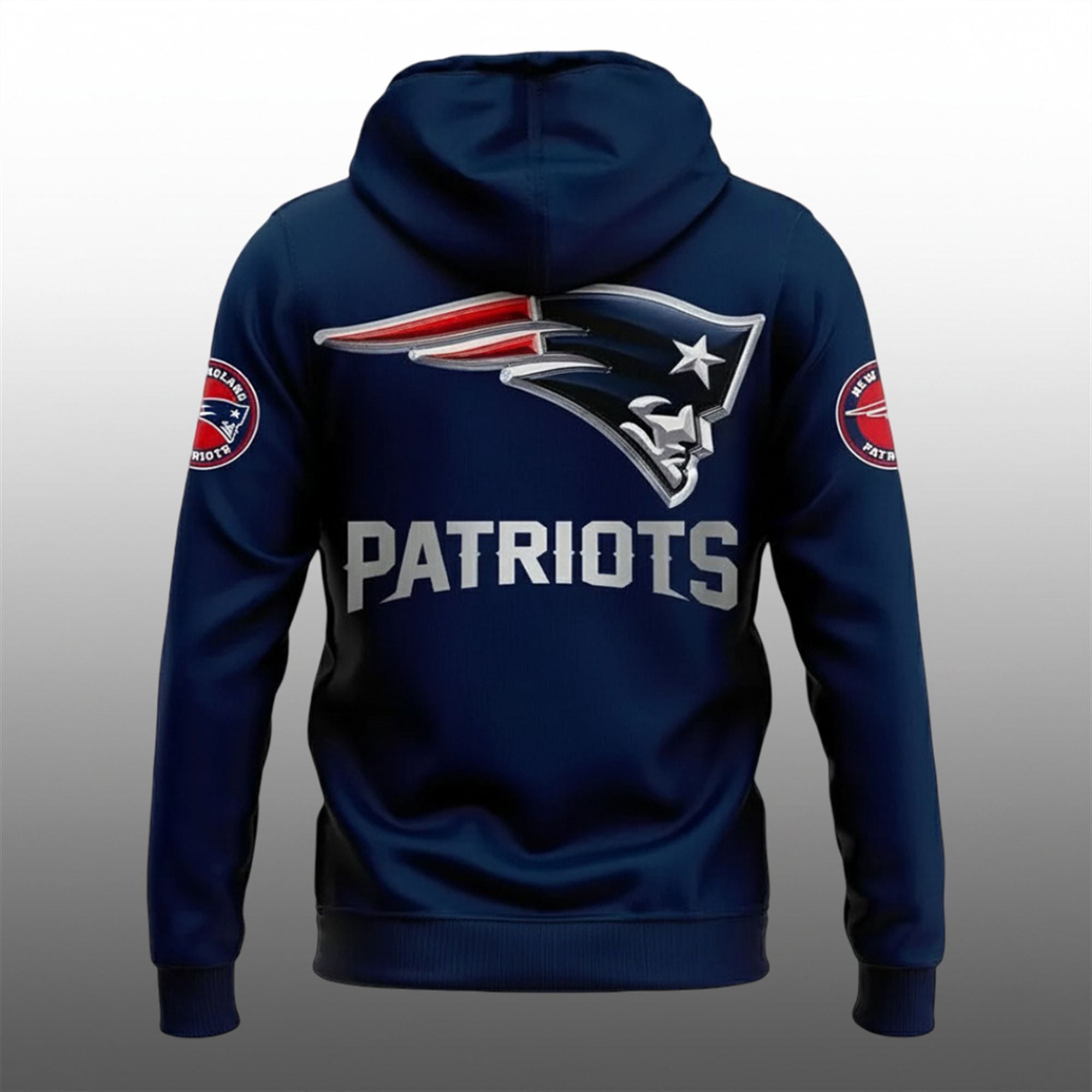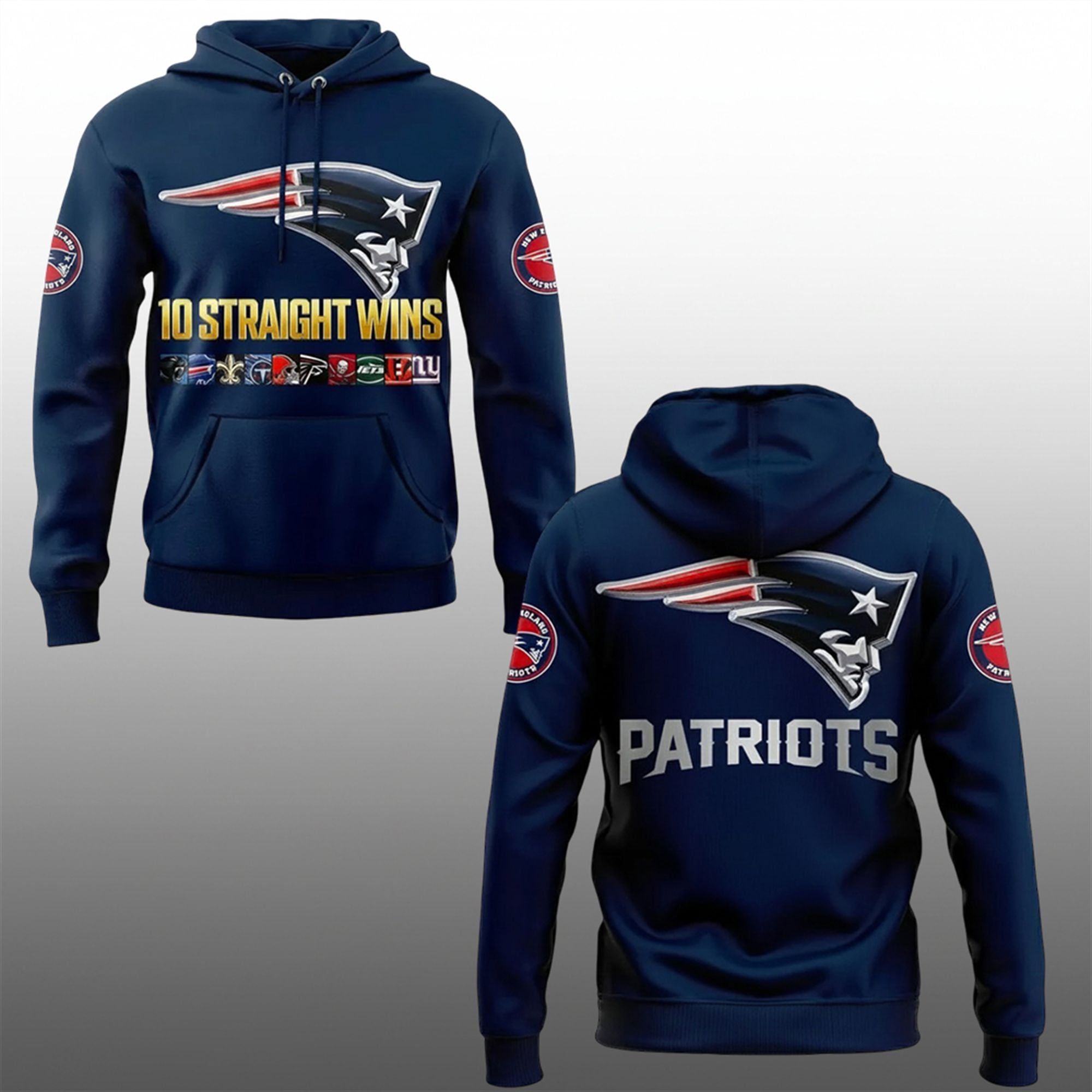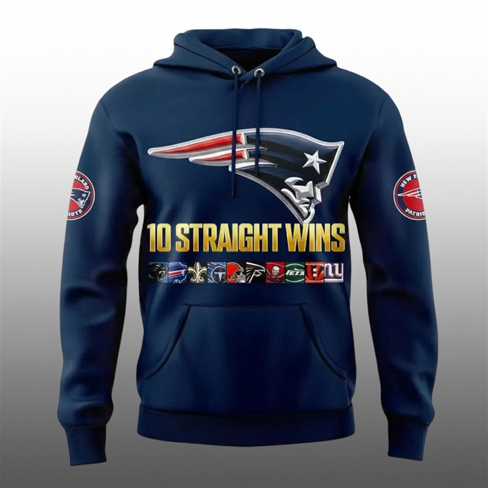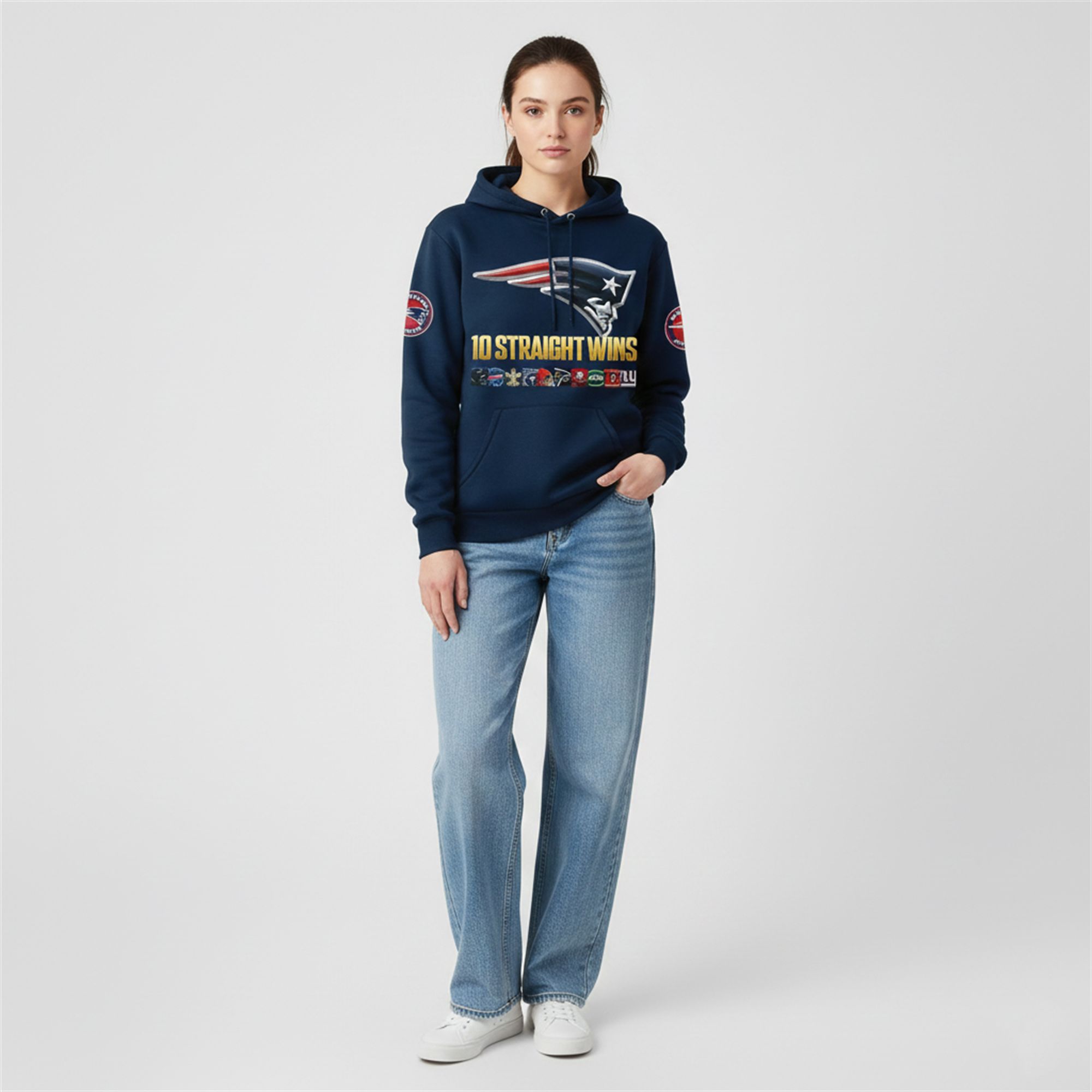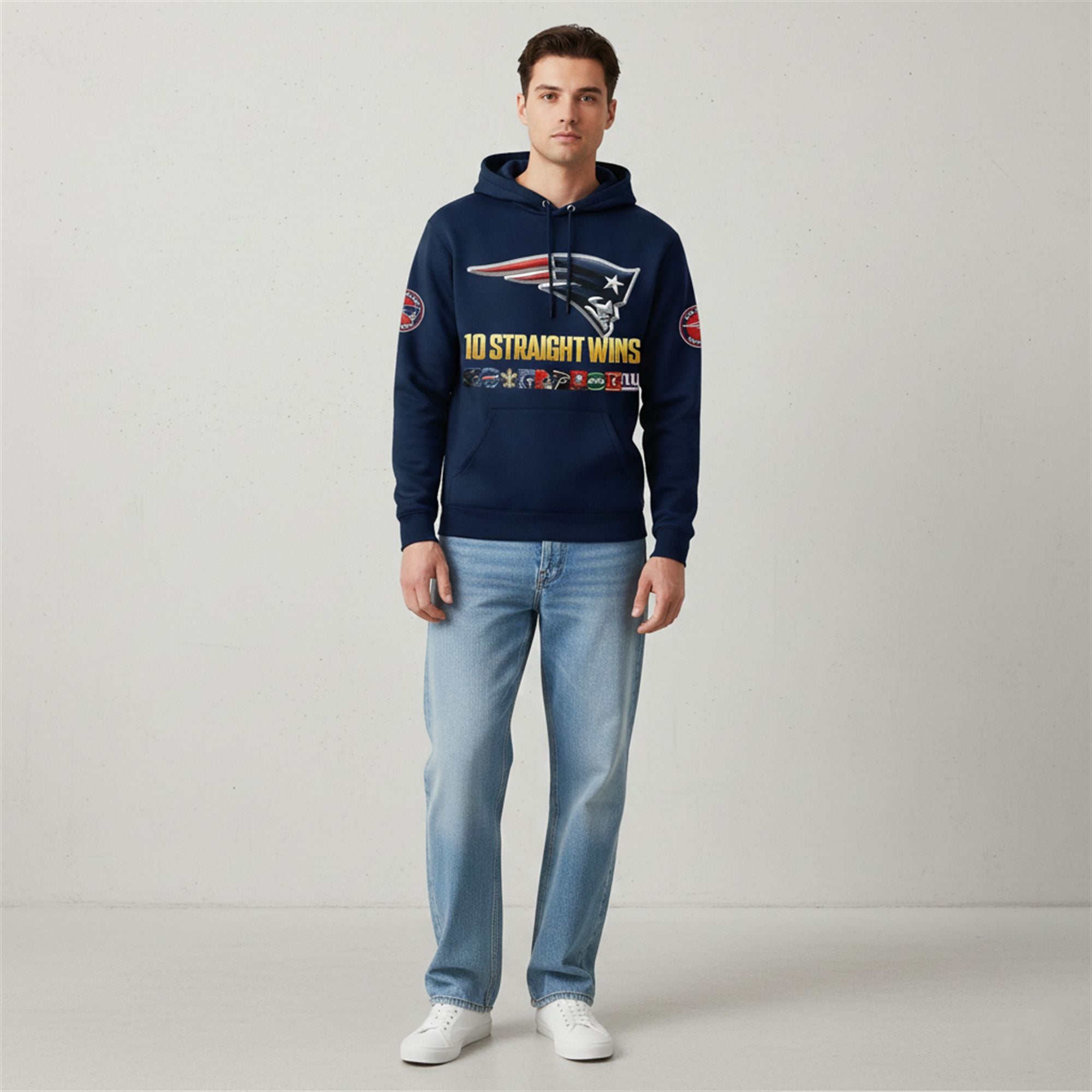 This hoodie is visually striking, featuring a deep navy blue base that perfectly matches the team’s colors. The front design is headline-grabbing, emblazoned with golden “10 STRAIGHT WINS” typography. Below the text sits a unique “Row of Conquest”—a graphical strip displaying the helmets of the ten teams defeated during this historic run (including the Bills, Saints, Titans, and Giants). The back of the hoodie is equally impressive, featuring a massive, high-definition Patriots logo and bold “PATRIOTS” lettering, ensuring your fandom is visible from every angle.