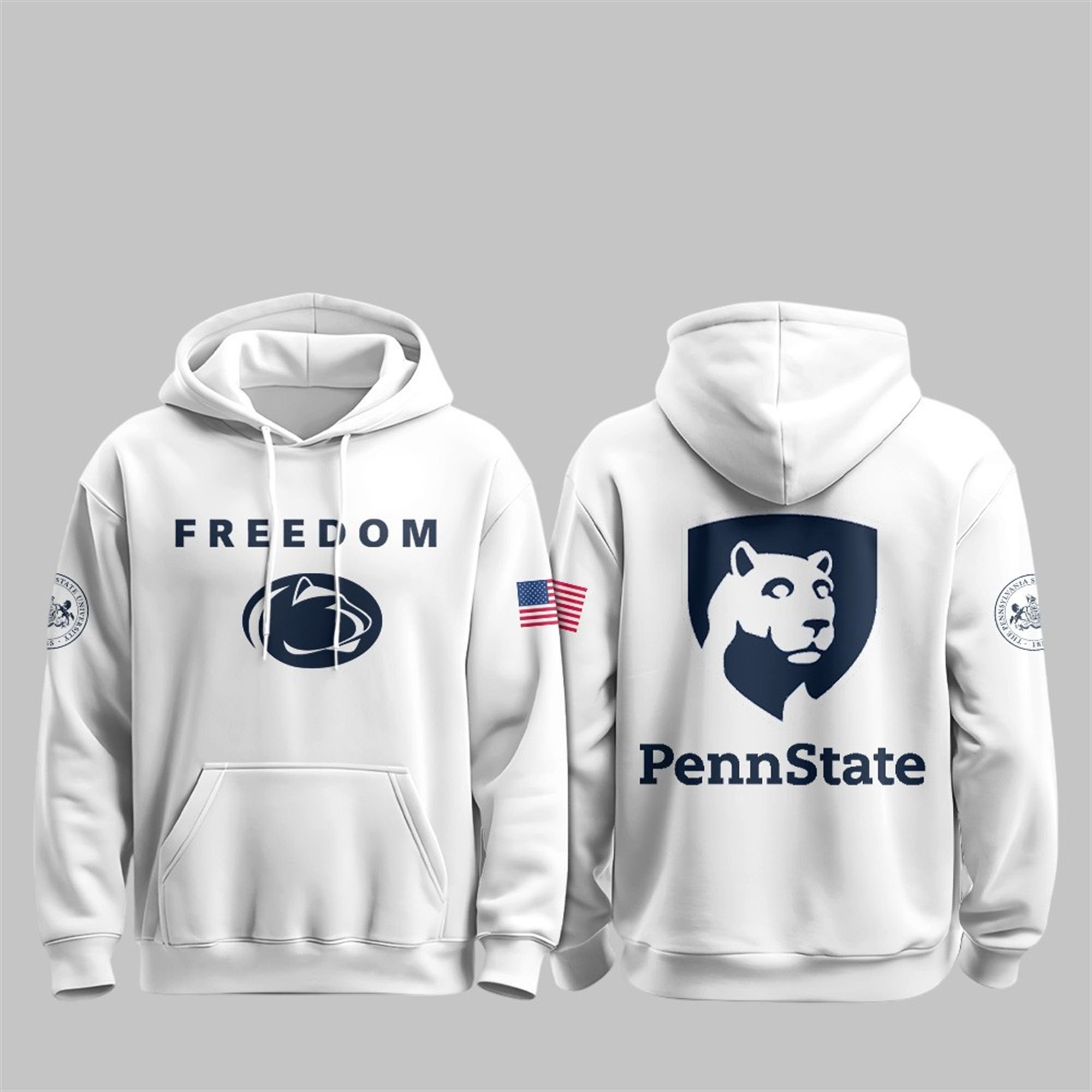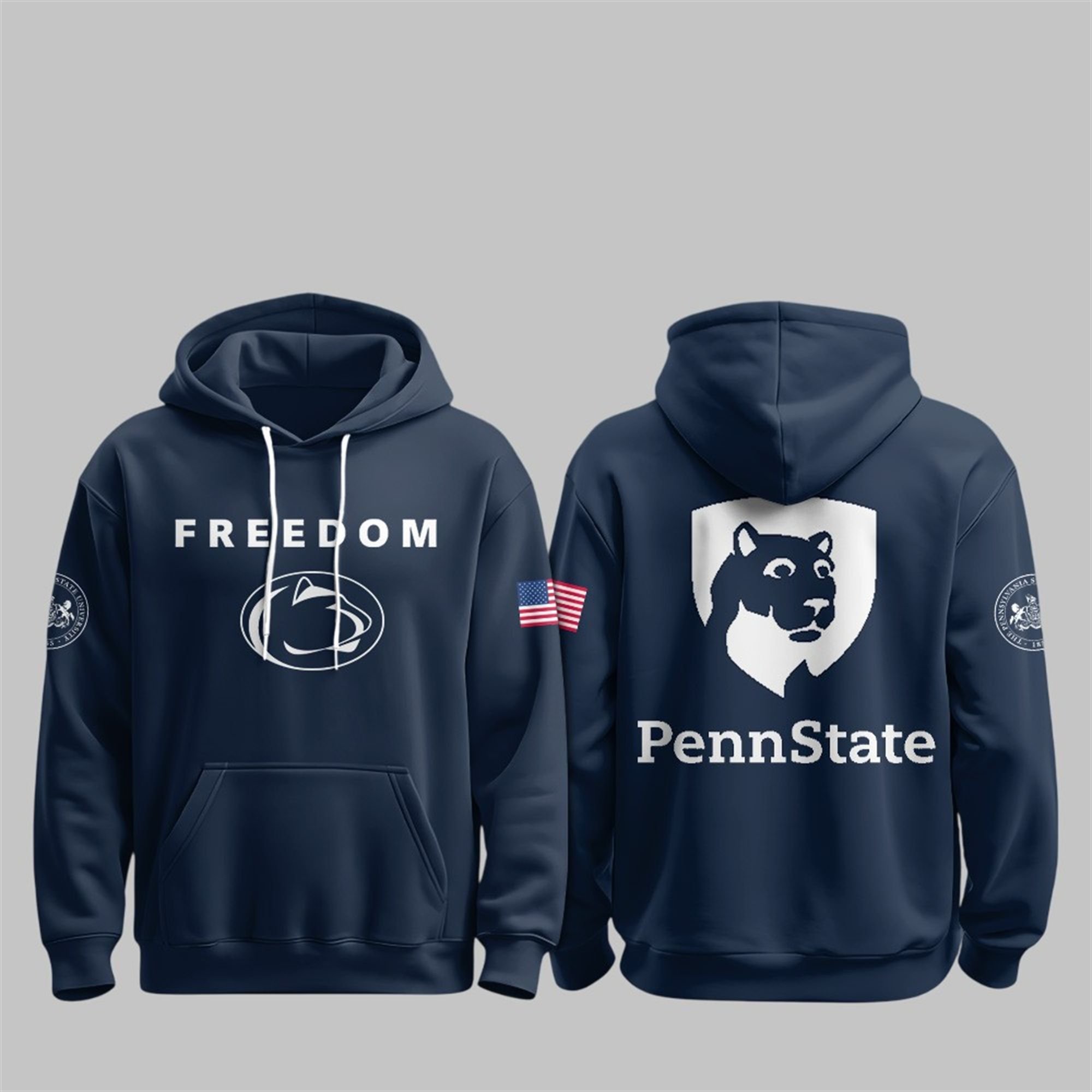 On the Front: The shirt leads with the word “FREEDOM” in a bold, modern typeface, set directly above the iconic Penn State Nittany Lions athletic logo. This combination immediately links the concept of liberty with the identity of the university.