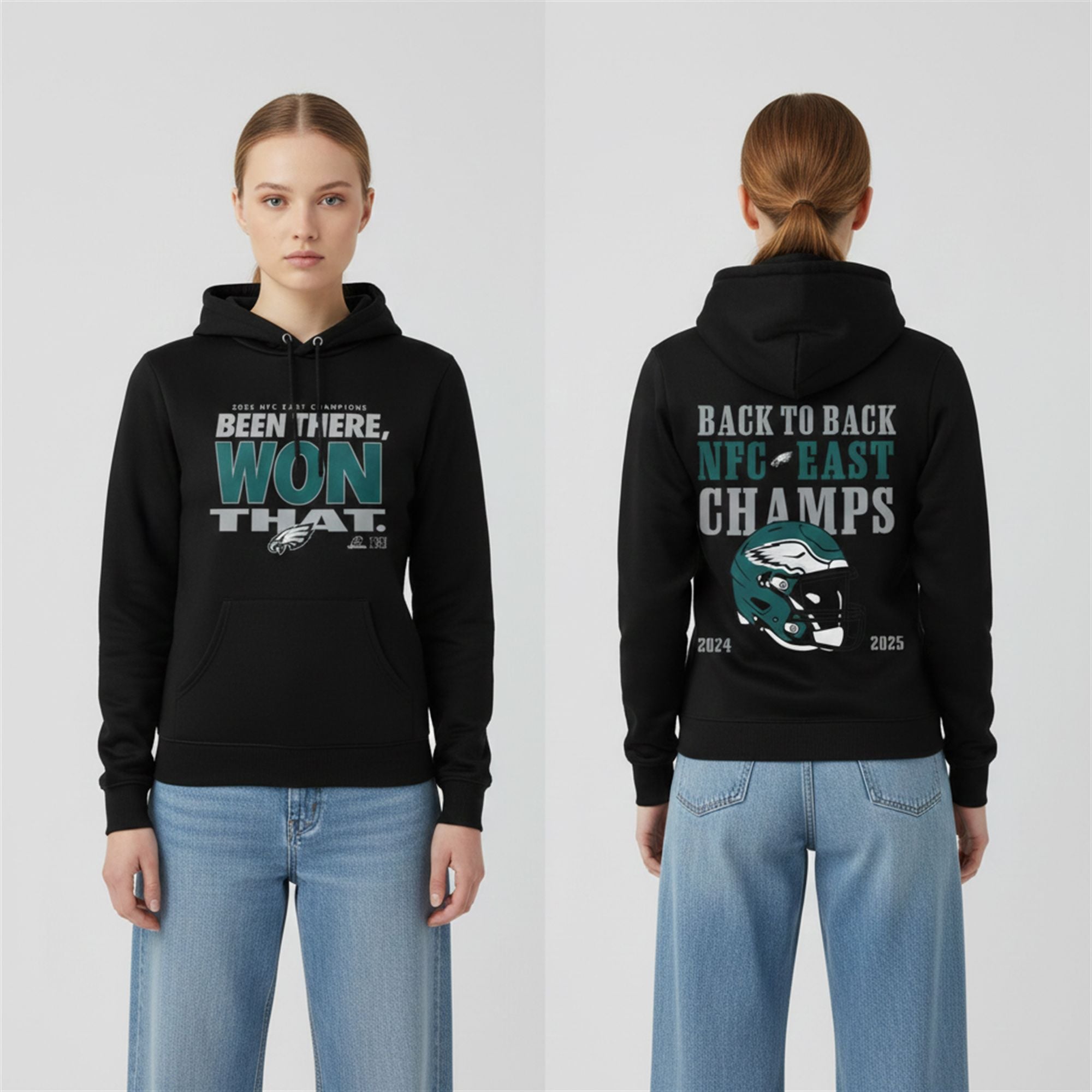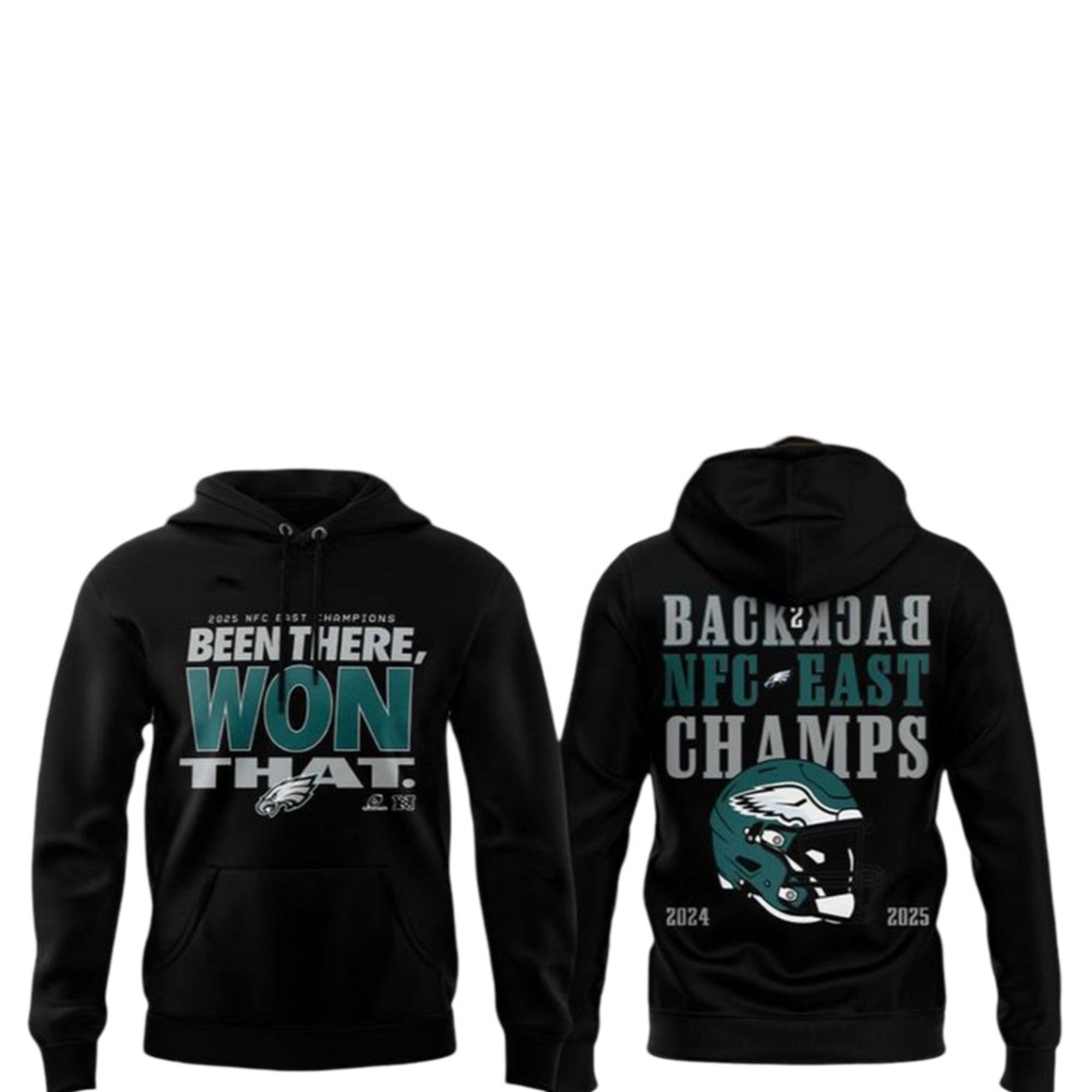 This hoodie features a striking, high-contrast design that commands attention. The front chest displays the “2025 NFC East Champions” text alongside the bold declaration: “BEEN THERE, WON THAT.” It perfectly captures the swagger of the Philadelphia fanbase. The back of the hoodie is equally impressive, featuring a “BACK 2 BACK” graphic with a stylized Eagles helmet and the championship years 2024 and 2025 clearly listed. It is a walking history book of the team’s recent success.