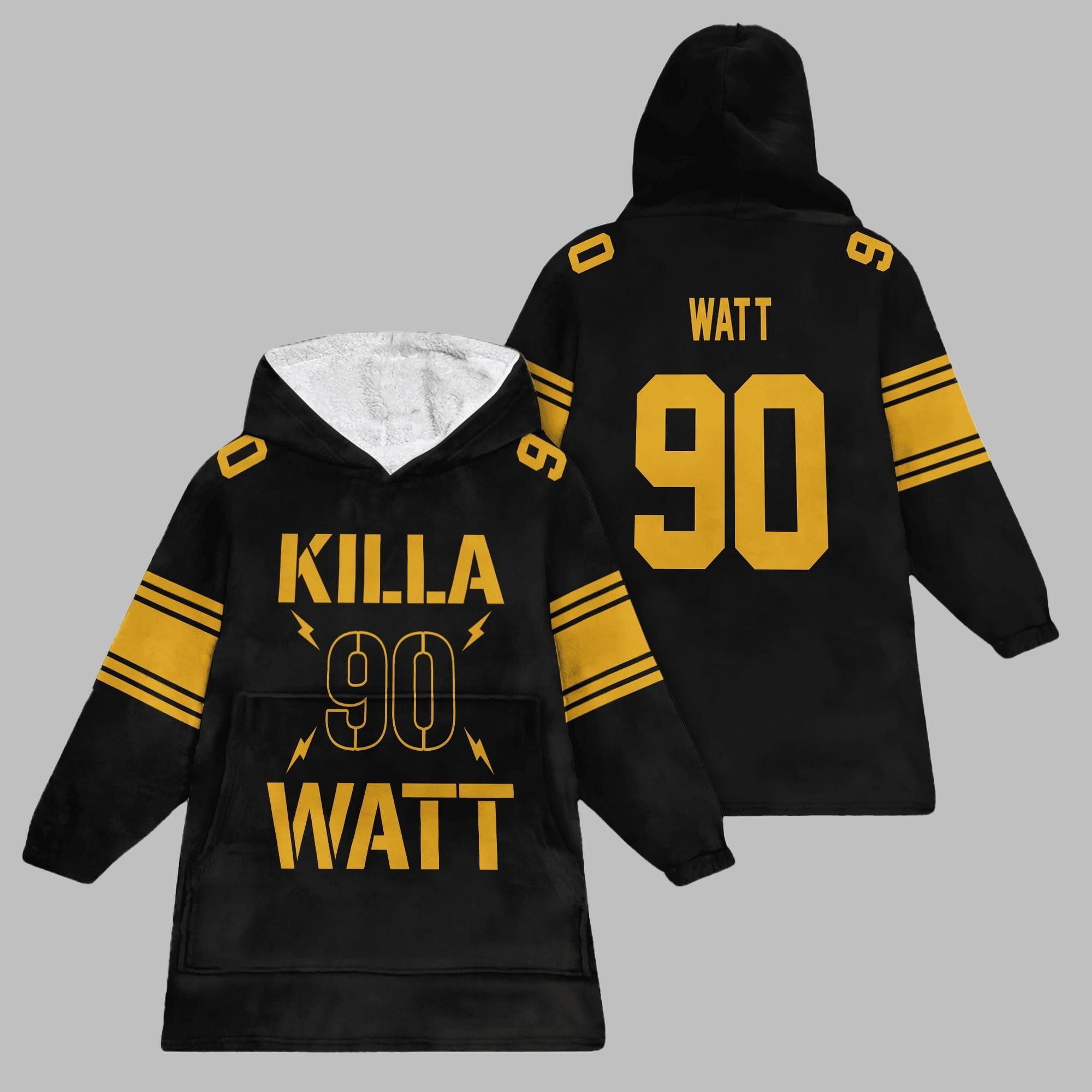 Prepare to take your Steelers fandom to a new level of warmth and intensity with the 2025 Pittsburgh Killa 90 Watt Blanket Hoodie. This isn’t just a hoodie; it’s your personal comfort fortress, designed for the fan who lives and breathes Black and Gold. Inspired by the relentless energy of superstar T.J. Watt, this wearable blanket combines the bold look of a jersey with the luxurious comfort of a plush blanket.